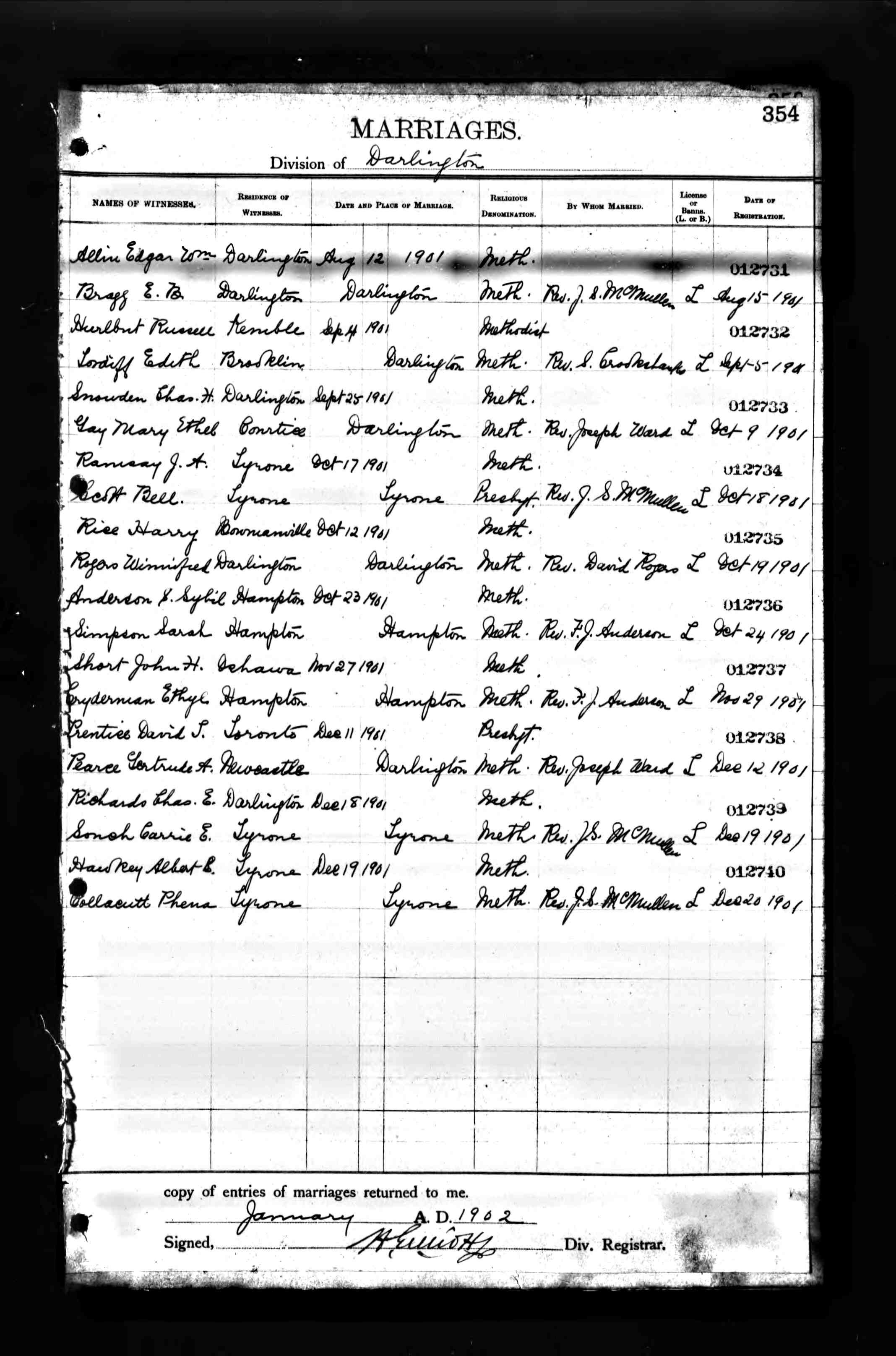 - Wesley Dobson Bragg : Born November 4, 1873, in Clarke Twp., Durham Co., Ontario, Canada; Died July 12, 1930, in Durham Co., Ontario, Canada (age 56). Buried in Bowmanville Cemetery, Bowmanville, Durham Regional Municipality, Ontario, Canada. Married (1) September 15, 1898, in Clarke Twp., Northumberland and Durham Cos., Ontario, Canada, to Amelia "Millie" Osborne: Born August 25, 1867, in Clarke Twp., Ontario, Canada; Died March 25, 1924, in Lot 5, Concession 1, Darlington Division, Durham Co., Ontario, Canada (age 56). Buried in Bowmanville Cemetery, Bowmanville, Durham Regional Municipality, Ontario, Canada. Married (2) February 14, 1927, at the United Church Parsonage, Newcastle , Ontario, Canada, to Edna Viola Elizabeth Rickard: Born May 21, 1894, in Darlington, Durham Co., Ontario, Canada; Died May 24, 1979, in Newcastle, Durham Co., Ontario, Canada (age 85). Buried in Bowmanville Cemetery, Bowmanville, Durham Regional Municipality, Ontario, Canada.