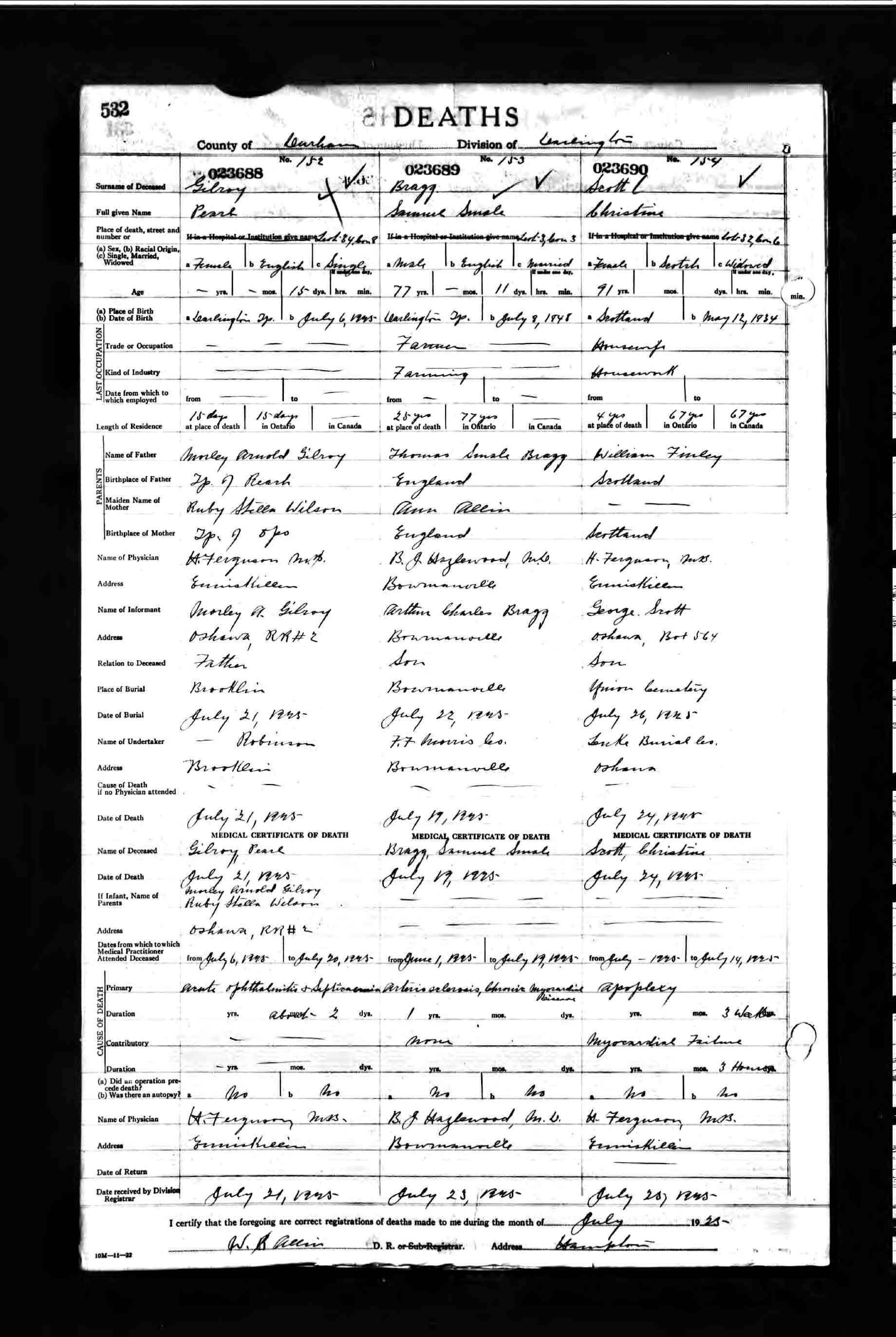 Samuel Smale Bragg died July 19, 1925, in Lot 3 Concession 3, Darlington Twp., Durham Co., Ontario, Canada, at age 77. Buried in Bowmanville Cemetery, Bowmanville, Durham Regional Municipality, Ontario, Canada.