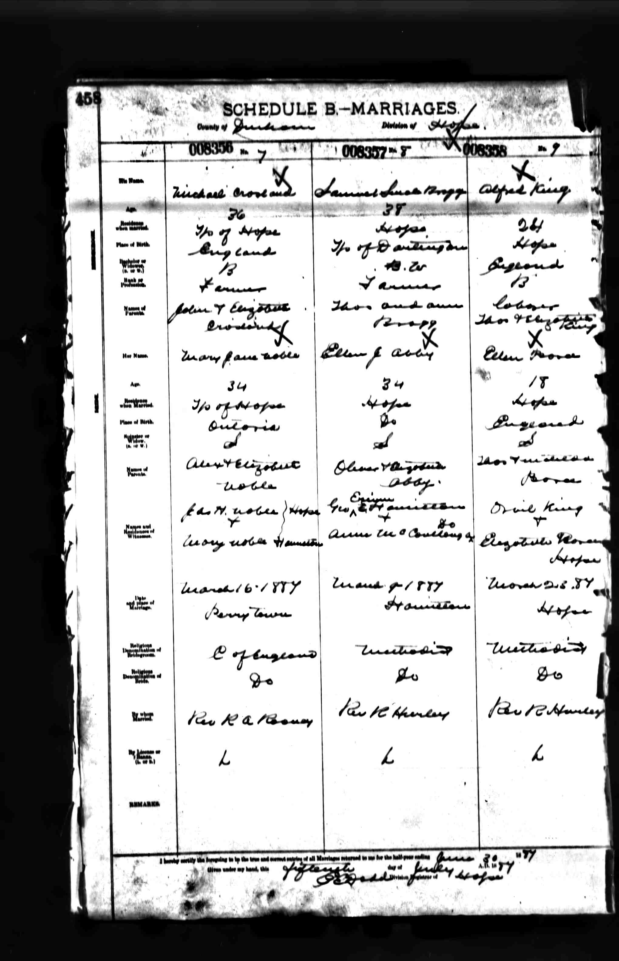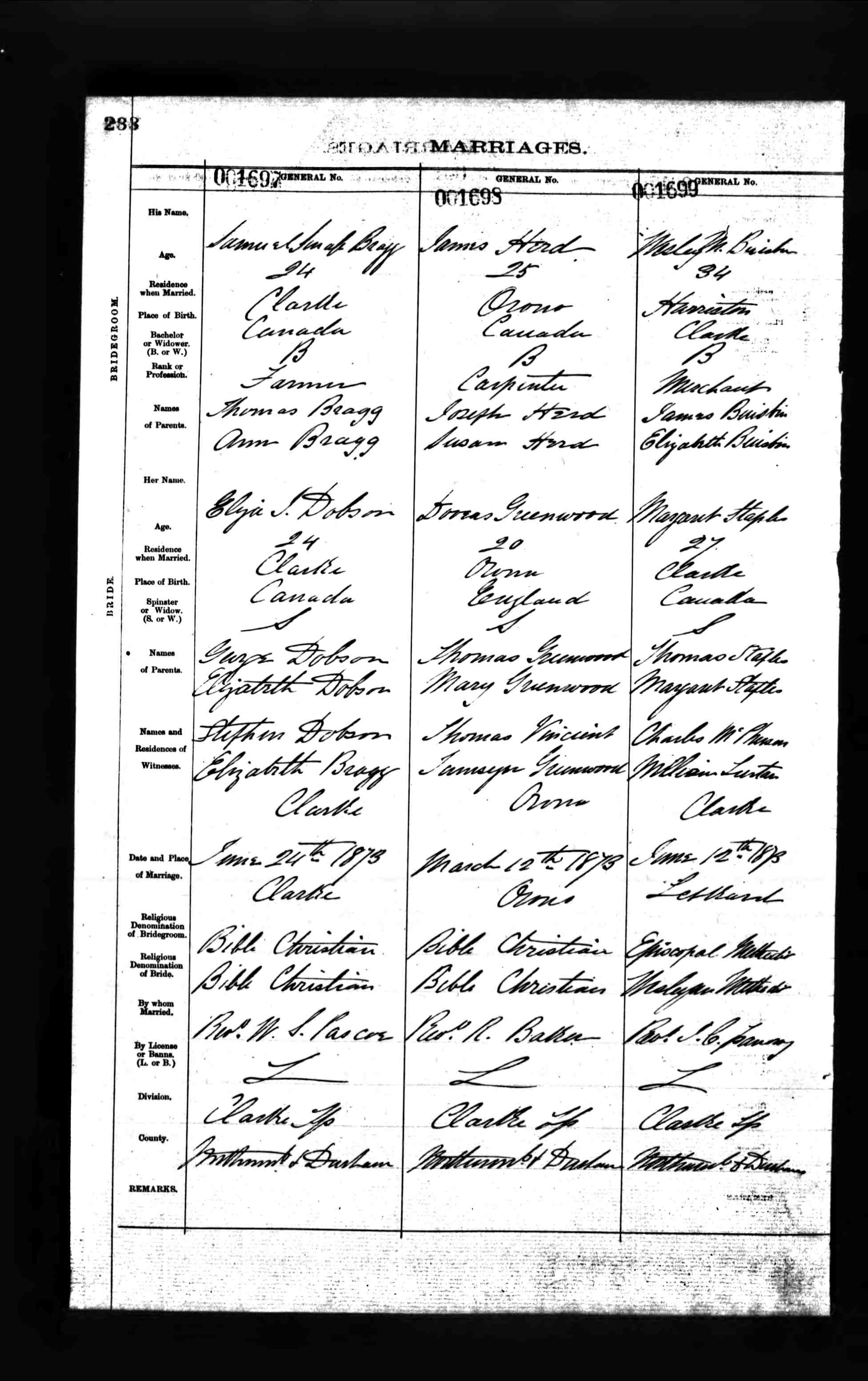 Samuel Smale "Sam" Bragg and Elizabeth Jane "Eliza" Dobson were married June 24, 1873, in Clarke Twp., Northumberland and Durham Co., Ontario, Canada.