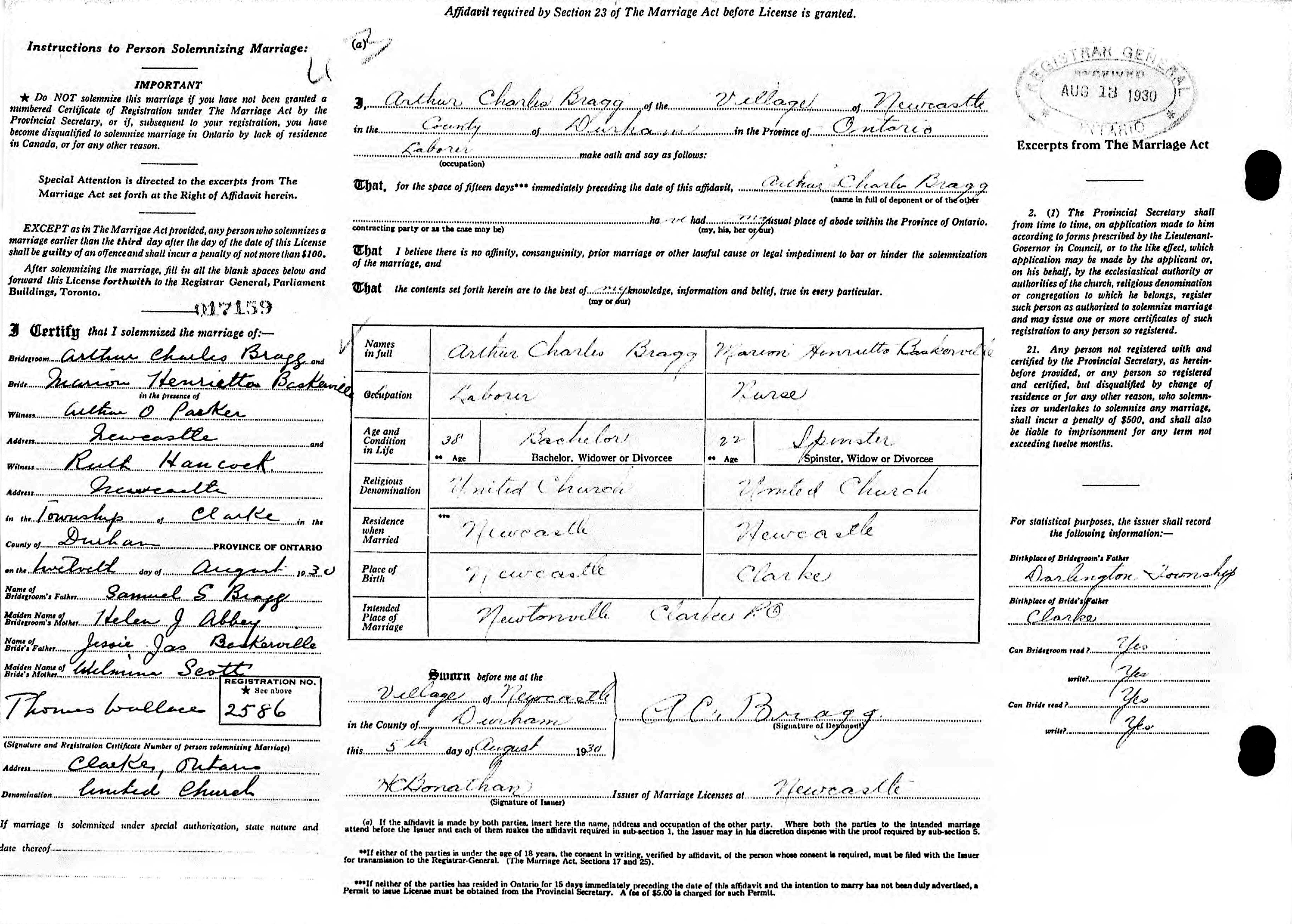 Arthur Charles Bragg and Marion Henrietta Baskerville were married August 12, 1930, at the United Church Parsonage, Newtonville , Ontario, Canada.