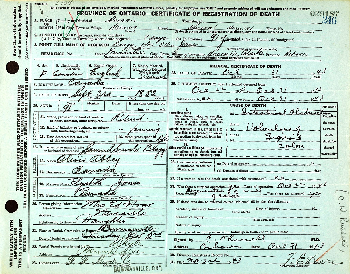 Ellen Jane (Abbey) Bragg died October 31, 1943, at Oshawa General Hospital, Oshawa, Durham Co., Ontario, Canada, at age 91. Buried in Bowmanville Cemetery, Bowmanville, Durham Regional Municipality, Ontario, Canada.