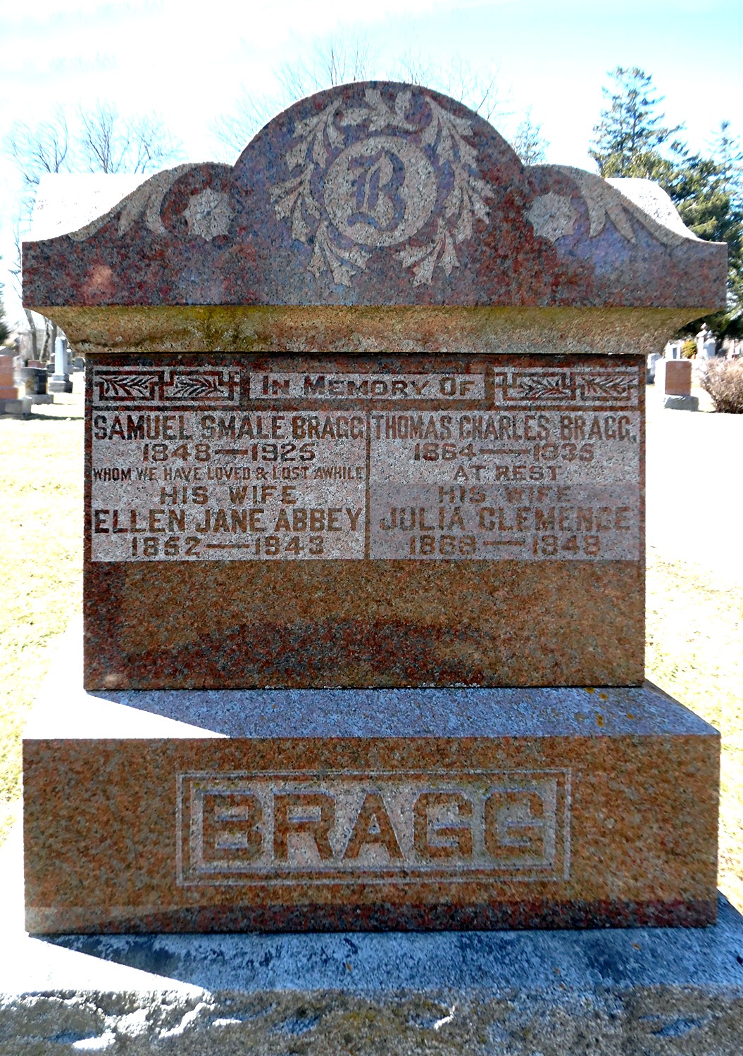 Samuel Smale "Sam" Bragg and Ellen Jane (Abbey) Bragg are buried in Bowmanville Cemetery, Bowmanville, Durham Regional Municipality, Ontario, Canada. Thanks to Find-A-Grave for making this image available.