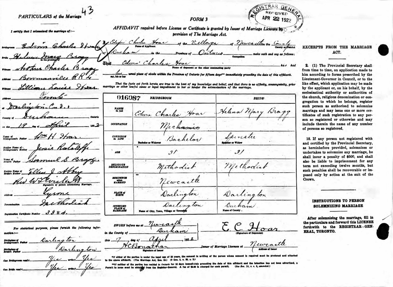 Edwin Charles "E. C." Hoar and Helena Mary "Lena" Bragg were married April 19, 1922, in Newcastle, Ontario, Canada.