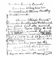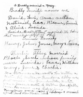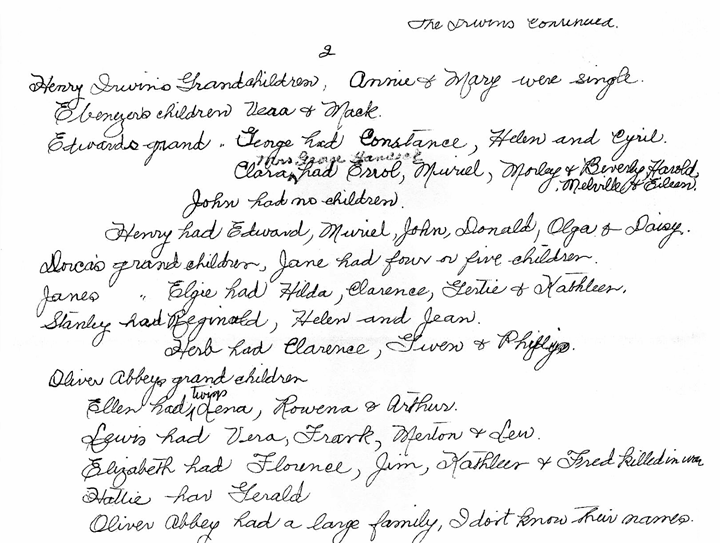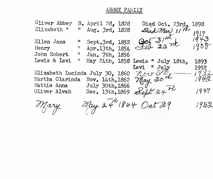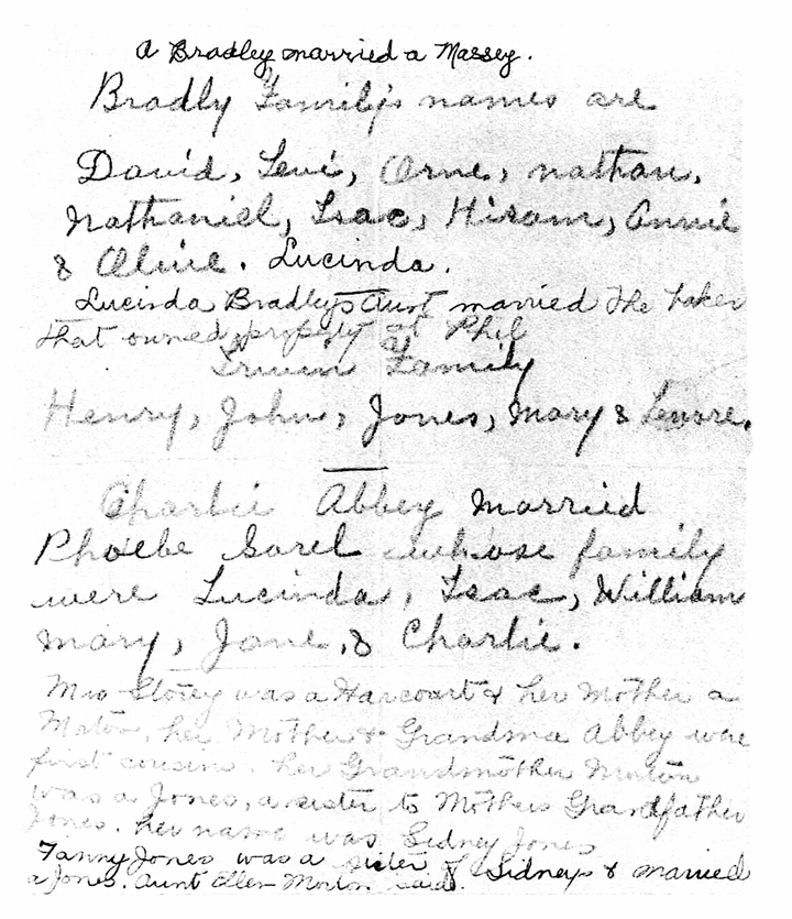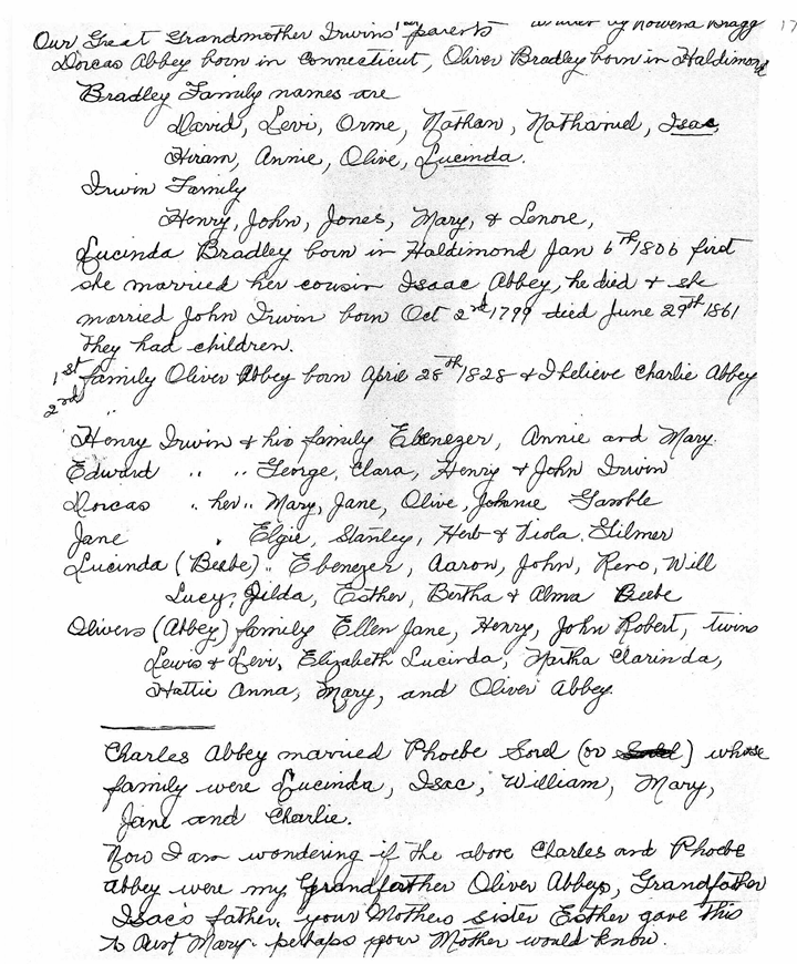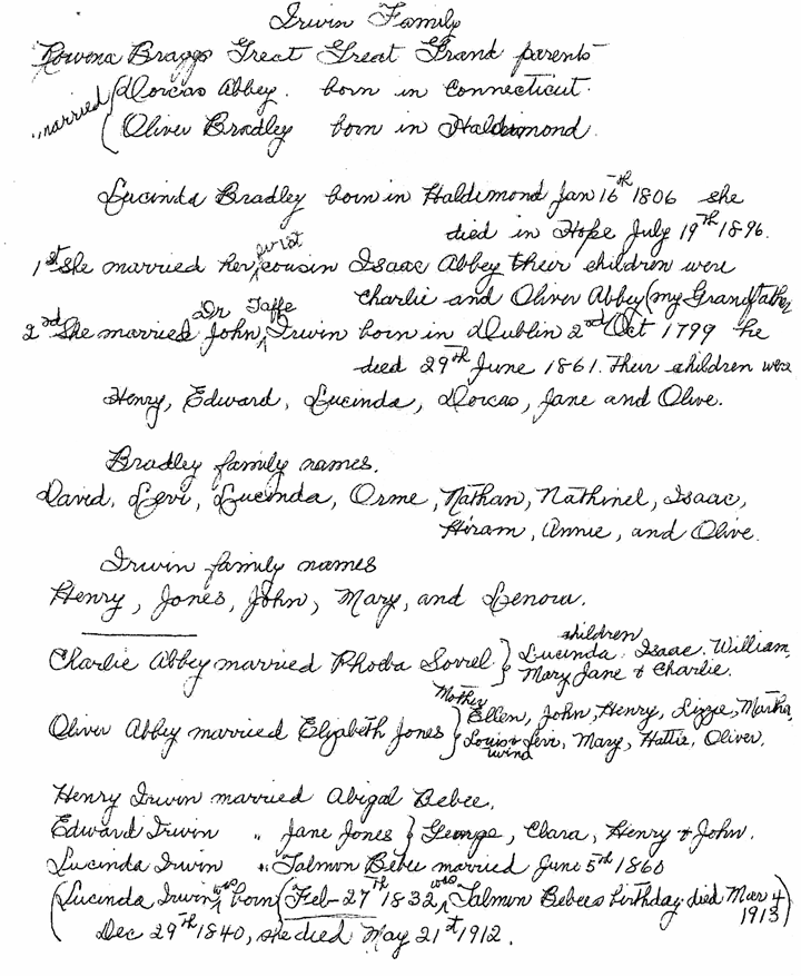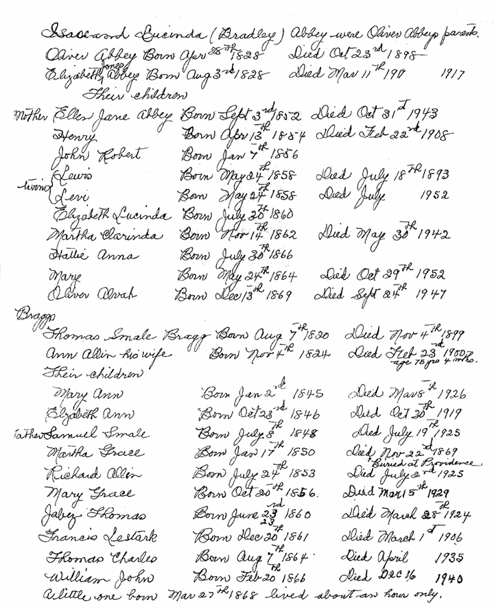 The following nine pages of recollections and thoughts were compiled by Rowena Jane Bragg, who died February 11, 1995, at Marnwood Lifecare Centre, Bowmanville, Durham Regional Municipality, Ontario, Canada, at age 104. Some mention is made of the Abbey branch. This information was forwarded by Eleanor Whyley, a descendant of Lucinda Bradley.