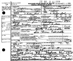 Cora Ethyl Olivia (Johnson) Johnson died November 22, 1970, at Riverside Community Memorial Hospital, Waupaca, Waupaca Co., WI, at age 70. Buried in West Akers Cemetery, Ridgeland, Dunn Co., WI.