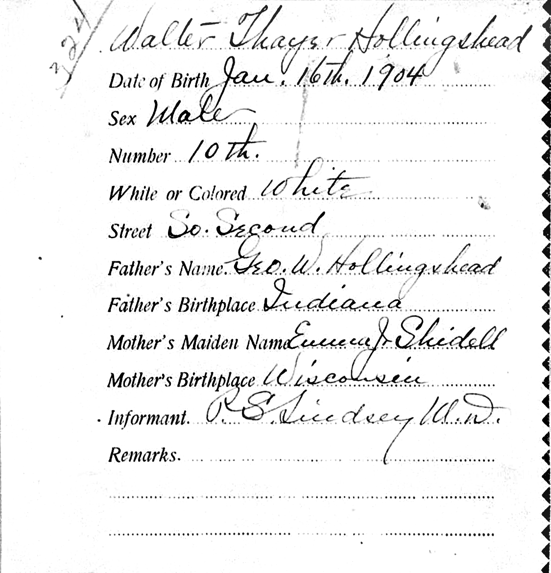 Walter Thayer Hollingshead was born January 16, 1904, in Santa Monica, Los Angeles Co., CA.