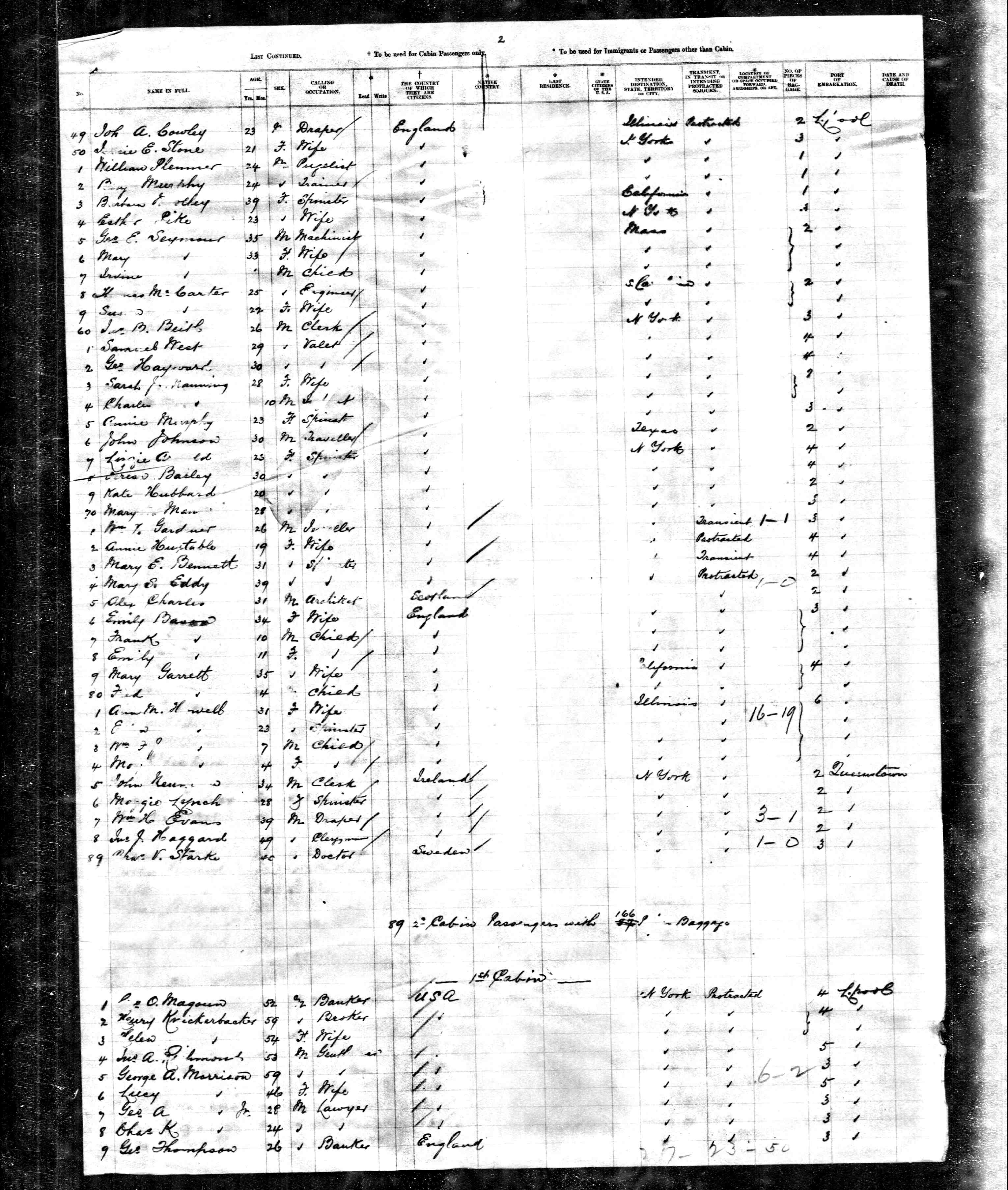 Mary Garrett (age 35) and Fred Garrett (age 4) emigrated from England, departing Liverpool aboard S. S. Umbria, arriving in the Port of New York on October 3, 1892. Their intended destination is California.