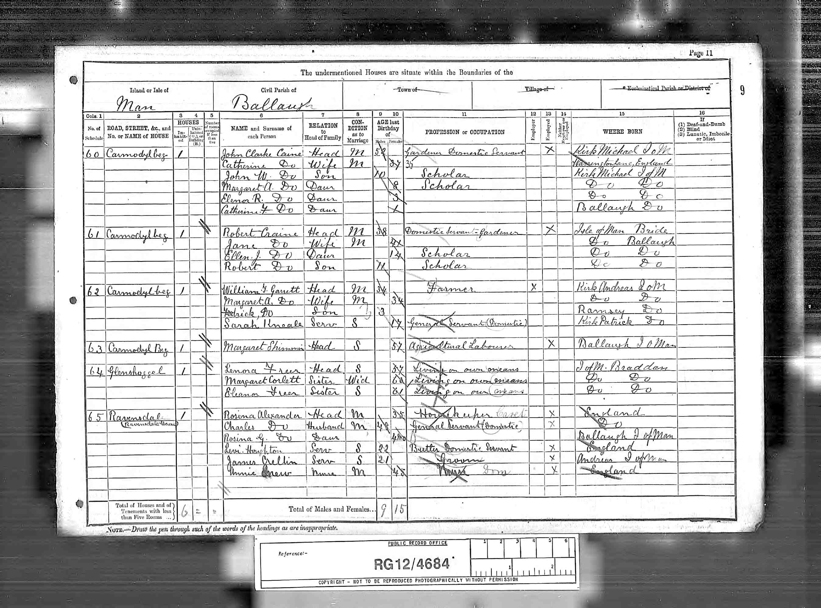 The 1891 Isle of Man Census taken on shows William T. Garrett (age 34) born in Kirk Andreas, Isle of Man, is a Farmer living in Ballaugh Civil Parish, Isle of Man. Living with him is his wife, Margaret A. Garrett (age 34) born in Kirk Andreas, Isle of Man. Also living there is his son, Fredrick Garrett (age 3) born in Ramsey, Isle of Man. Also living there is an unmarried General Servant Domestic: Sarah Kneale (age 17) born in Kirk Patrick, Isle of Man.