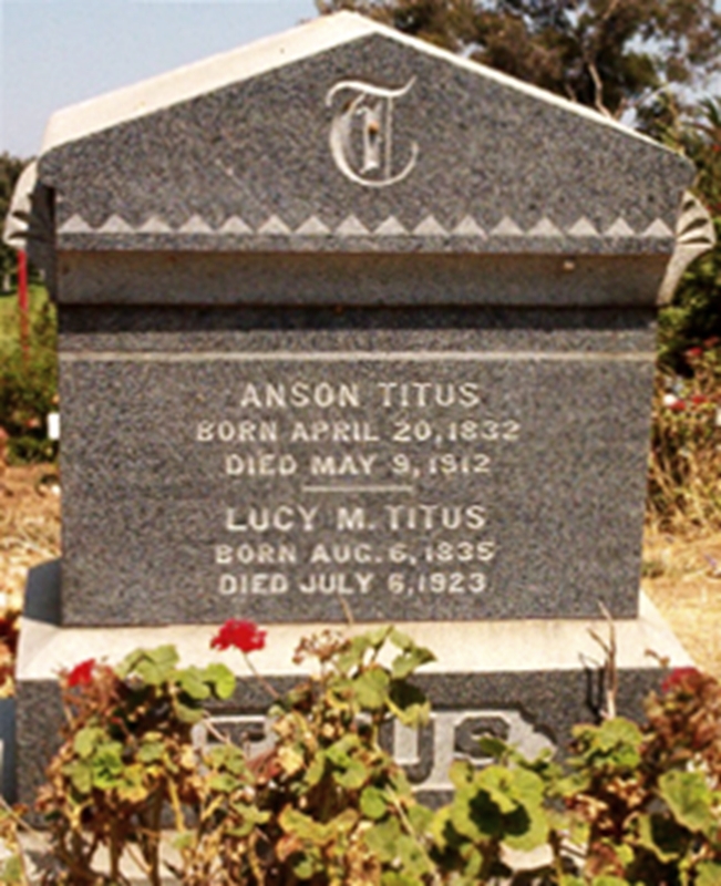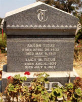 Anson A. Titus and Lucretia M. "Lucy" (Corey) Titus are buried in La Vista Memorial Park, National City, San Diego Co., CA. In 1870 Anson was a Millwright in Bradford Twp., Chickasaw Co., IA; in 1880 Anson was a Millwright in West Blue, Fillmore Co., NE; and in 1900 Anson was a Fruit Farmer in National City, San Diego Co., CA. Enos Corey lived with Anson and Lucy in 1880.