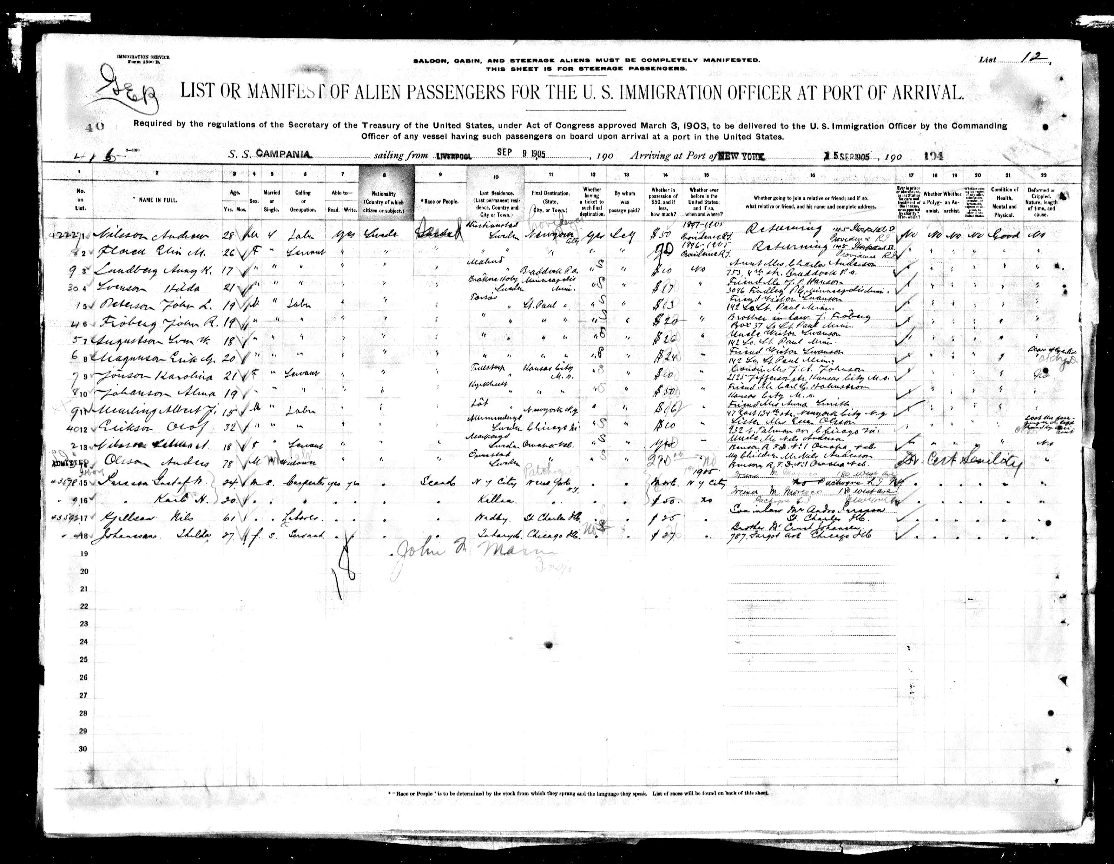 Erik emigrated with three other young men as a single male from Sweden to the U. S. A. from Liverpool September 9, 1905, on the S. S. Campania at age 20 as an unmarried Laborer using the name Erik G. Magnuson, arriving at the Port of New York on September 16, 1905. His last residence was at Tors�s, Sweden, and he had $24 in cash with him. His final destination is to visit a friend, Wistor Swanson, 142 So. St Paul, Minn. He has a paid ticket to his final destination, which he paid for himself. He has scars of the eyelid.