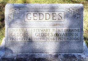 - Stewart Porterfield "Stew" Geddes : Born November 30, 1919, in Belgrave, Huron Co., Ontario, Canada ; Died September 30, 2014, in London, Middlesex Co., Ontario, Canada (age 94). Buried in Brandon Cemetery, Belgrave, Huron Co., Ontario, Canada. Married in Canada, to Amy Lorraine Vardon: Born April 7, 1923, in Unknown; Died about August 30, 2006, in London, Middlesex Co., Ontario, Canada (age 83). Buried in Brandon Cemetery, Belgrave, Huron Co., Ontario, Canada.