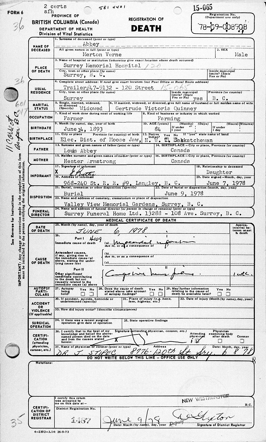 Merton Vernon "Verne" Abbey died June 6, 1978, at Surrey Memorial Hospital, Surrey, British Columbia, Canada, at age 84. Buried in Valley View Memorial Gardens, Surrey, British Columbia, Canada.