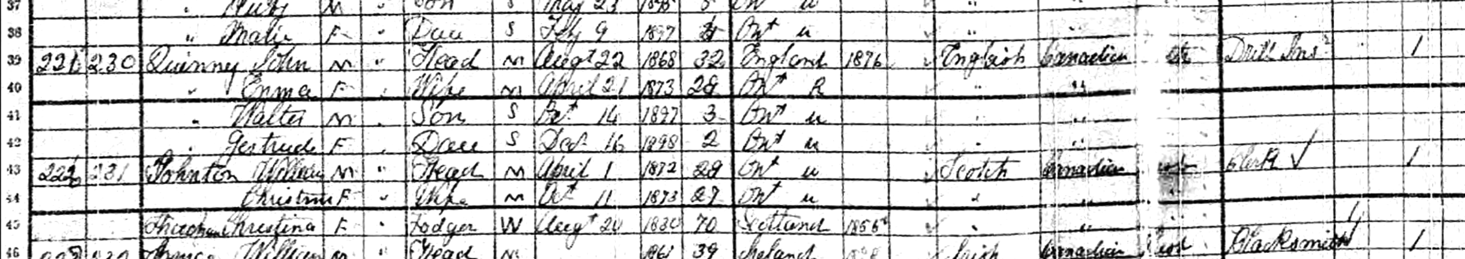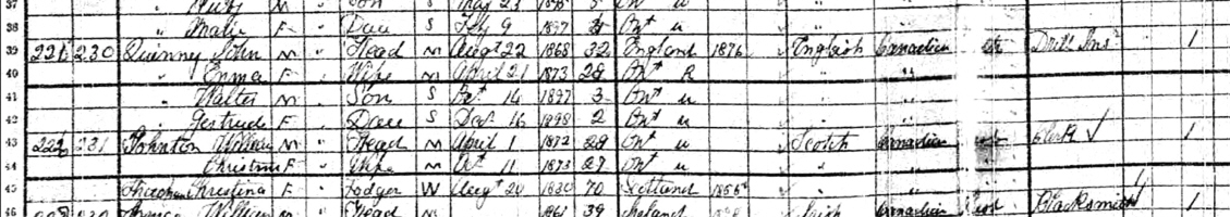 The 1901 Canadian Census shows John Quinney (age 32) born August 22, 1868, in England, and having immigrated in 1876, and a Canadian citizen, is a married Drill Instructor, and is living in Ottawa City, Ontario, Canada. Living with him are: his wife, Emma Quinney (age 28) born April 21, 1873, in Ontario, Canada; his son, Walter Quinney (age 3) born October 14, 1897, in Ontario, Canada; and his daughter, Gertrude Quinney (age 2) born December 16, 1898, in Ontario, Canada.