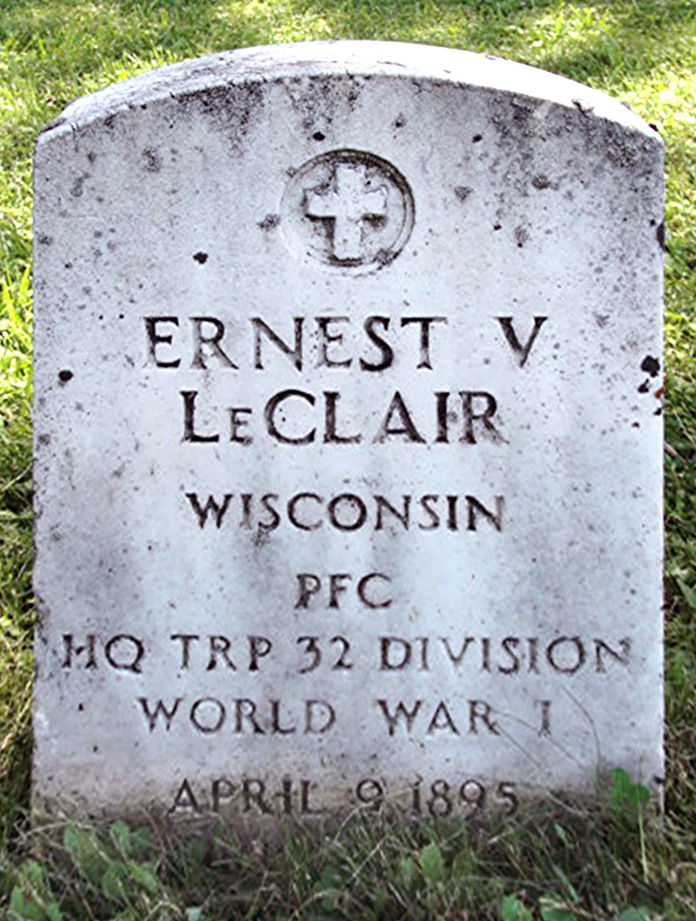 Ernest Victor LeClair is buried in Greenwood Cemetery, 8402 Tower Ave, Superior, Douglas Co., WI, 54880; Blk 9 Ring 4. WI PFC HQ TRP 32 DIVISION WWI. Thanks to Find-A-Grave for making this image available.