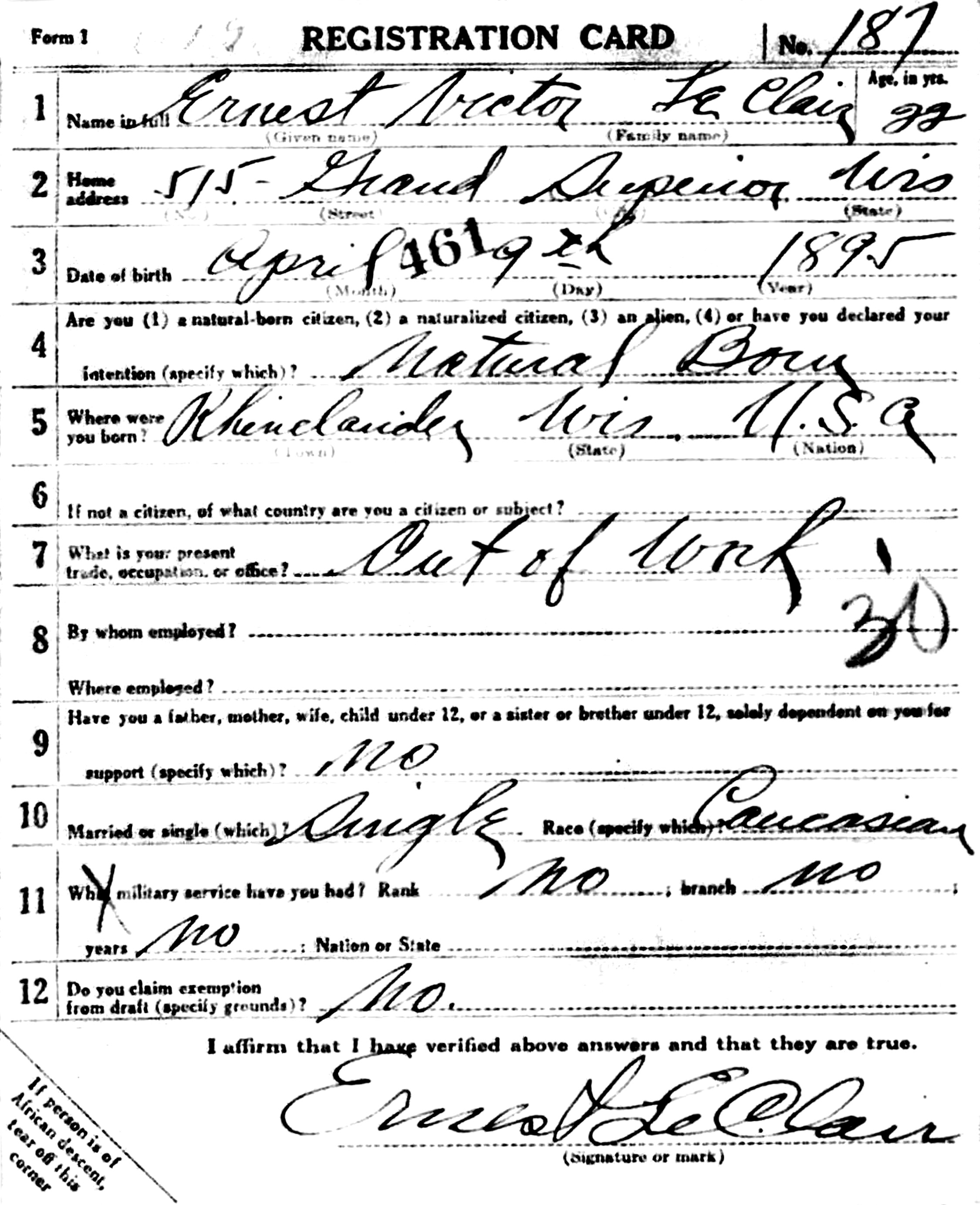 The WWI Draft Registration Report dated June 5, 1917, shows Ernest Victor LeClair (age 22) born April 9, 1895, in Superior, WI, is Single, Unemployed, and is living at 515 Grand, Superior, Douglas Co., WI. He has Medium Height, Medium Build, Light Blue Eyes and Light Brown Hair.