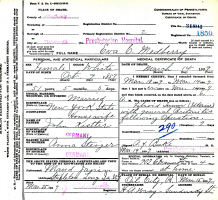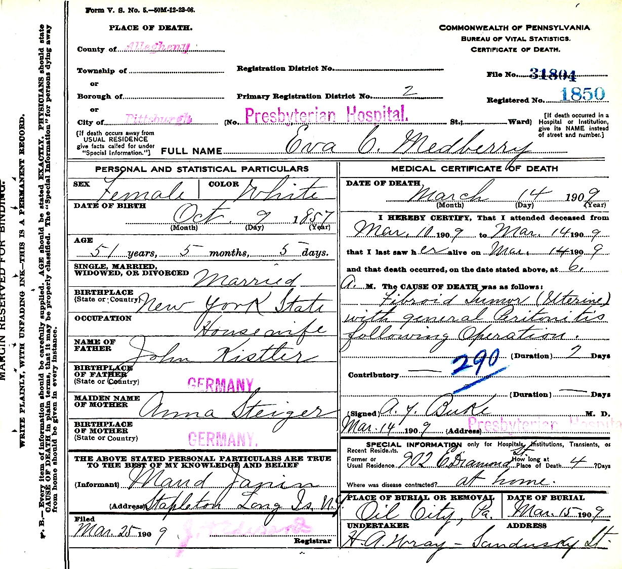 Eva Katherine (Kistler) Medberry died March 14, 1909, in Presbyterian Hospital, Pittsburgh, Allegheny Co., PA, at age 51. Buried in Oil City, Venango Co., PA.