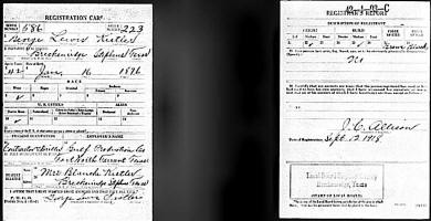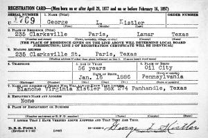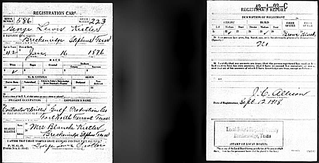 The WWI Draft Registration Report dated September 12, 1918, shows George Lewis Kistler (age 42) was judged "No". Erwin Lewis Kistler signed his name on the form. Medium Height, Medium Build, Brown Hair and Black Eyes. He was employed as a Driller and Contractor for Gulf Production Company in Fort Worth, Tarrant Co., TX. He was living in Breckenridge, Stephens Co., TX. His wife, Mrs. Blanche Kistler at the same address, was his nearest relative.