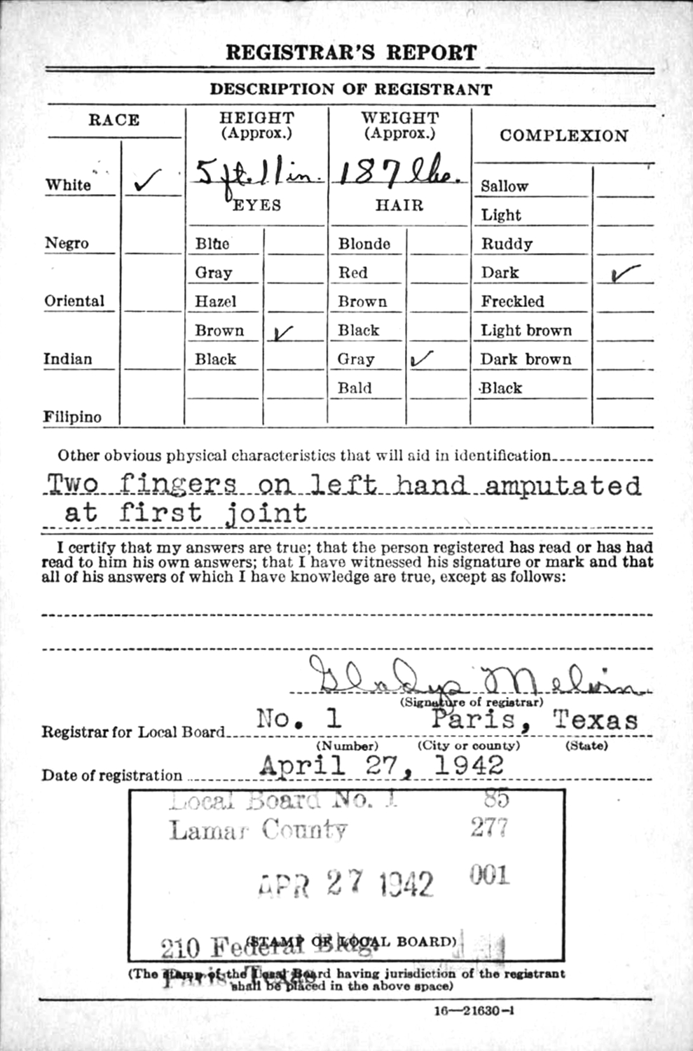 - Abbey, Erwin W, Odessa, Block 123, Lt/Rw 5, Space 3-A, Serv. # 5271, Date 01/04/1941