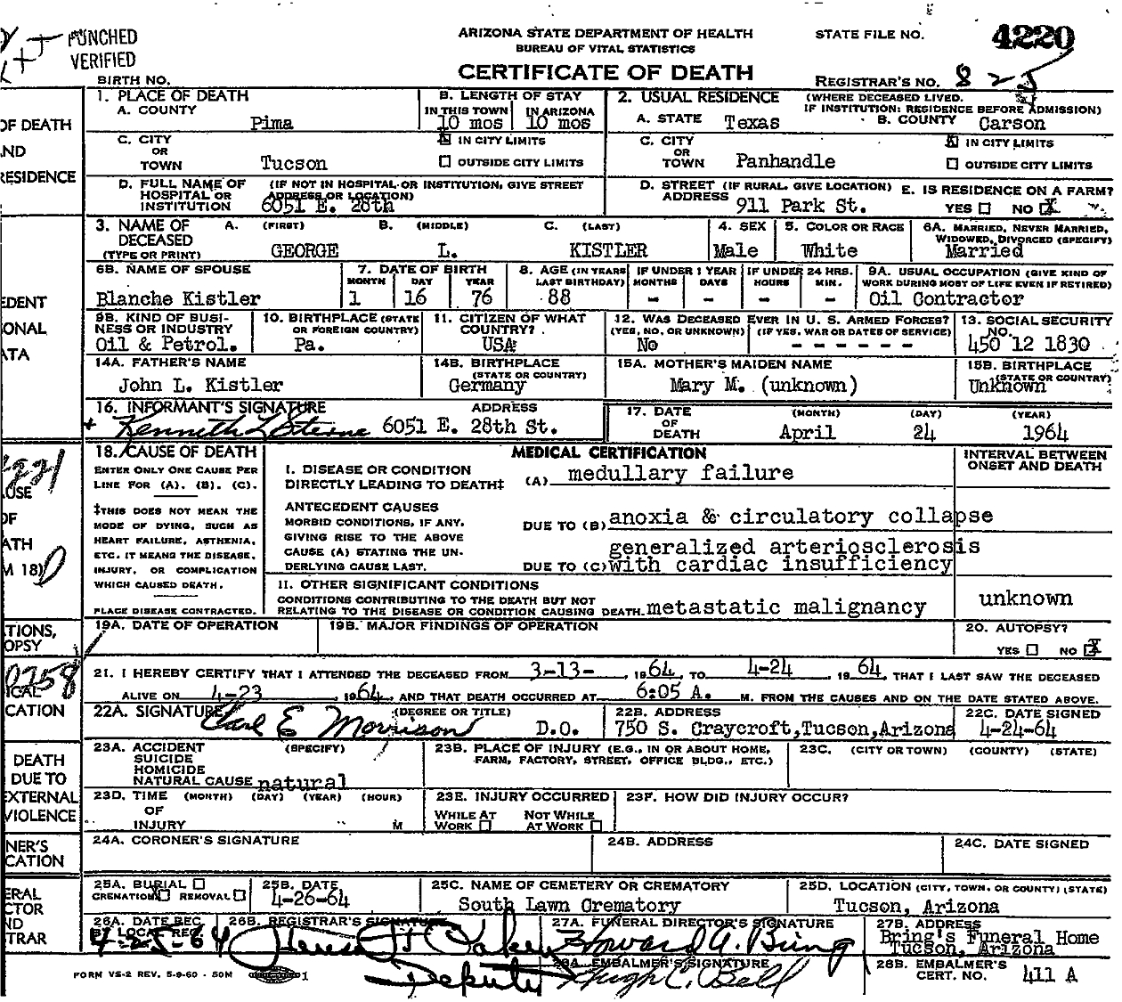 George Lewis Kistler died April 24, 1964, in Tucson, Pima Co., AZ, at age 88. Buried in Panhandle Cemetery, Panhandle, Carson Co., TX.