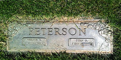 Verdus J. "Bert" Peterson and Fern Emily Rosebud (Nelson) Peterson are buried in Evergreen Memorial Gardens, Vancouver, Clark Co., WA. Thanks to Billion Graves for making this image available.