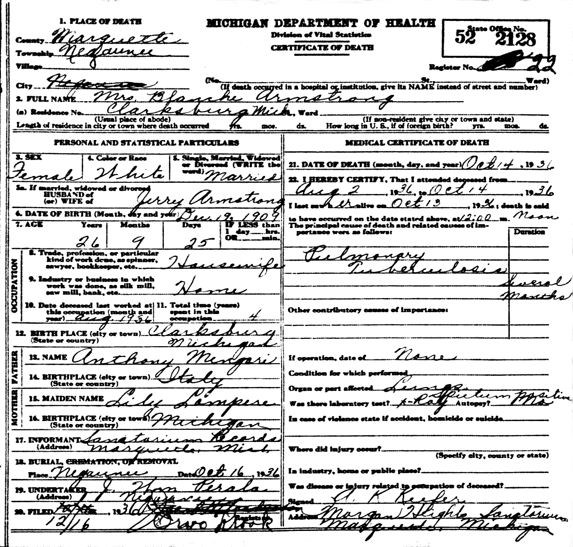 Blanche Alma (Mingori) Armstrong died October 14, 1936, at Morgan Heights Sanatarium, Negaunee Twp., Marquette Co., MI, at age 26, due to TB. Buried in in Negaunee, Marquette Co., MI.