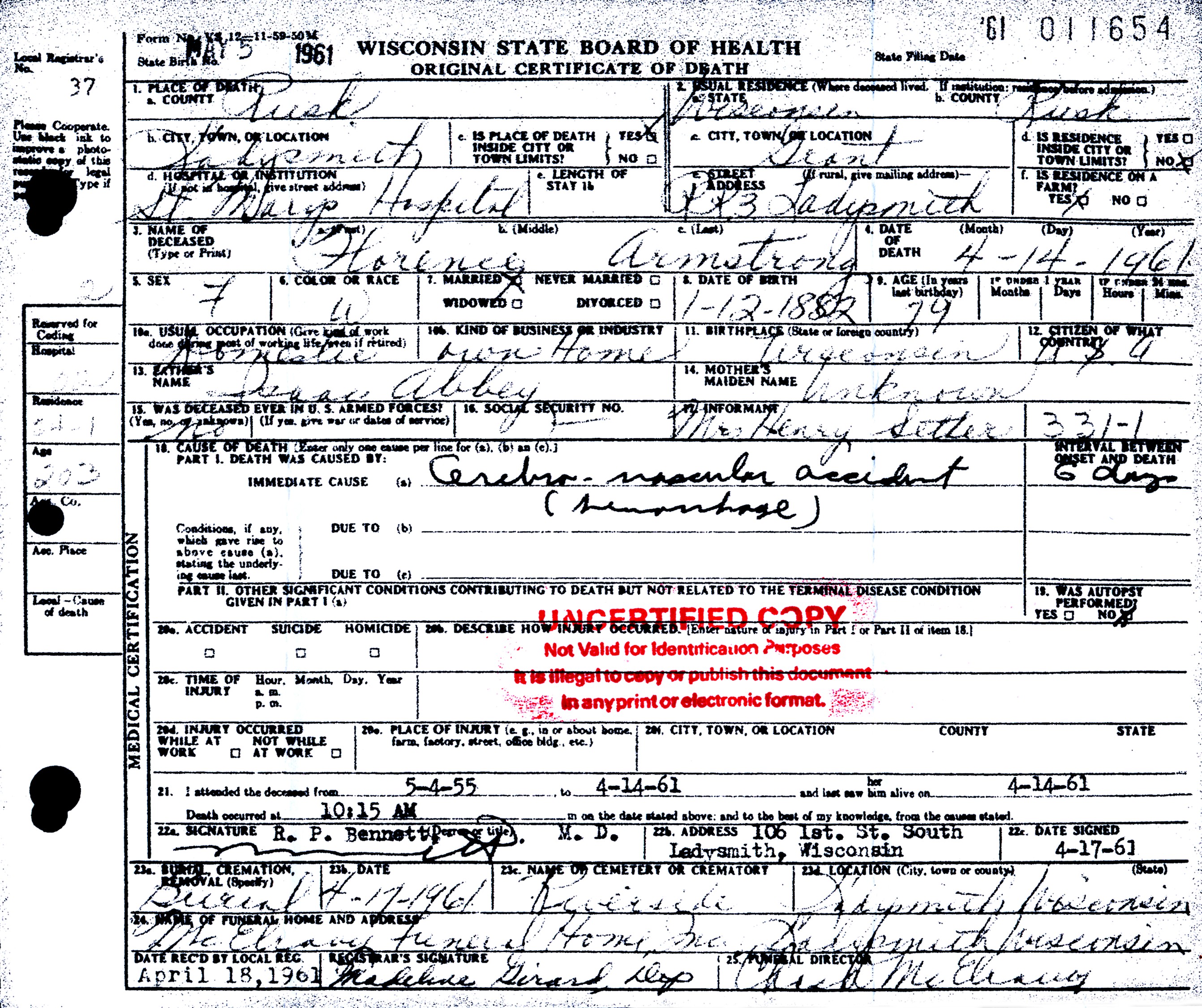 Florence Viola (Abbey) Armstrong died April 14, 1961, at St. Mary's Hospital, Ladysmith, Rusk Co., WI, at age 79. Buried in Riverside Cemetery, Ladysmith, Rusk Co., WI.