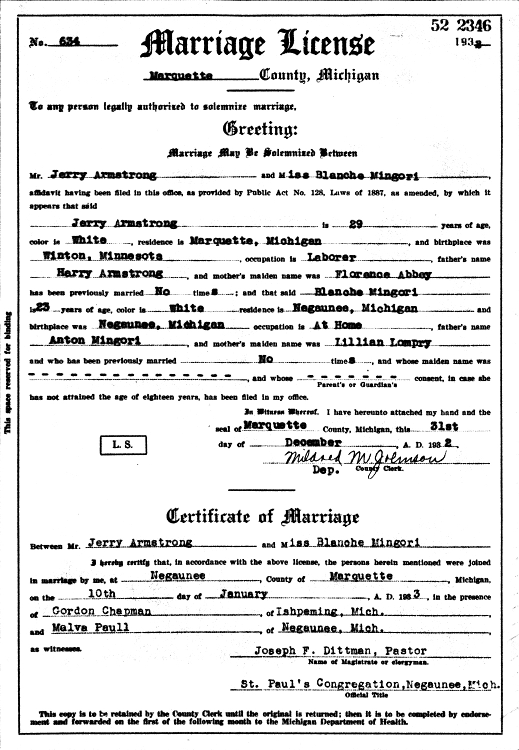 Sylvanus C. "Jerry" Armstrong and Blanche Alma Mingori were married January 10, 1933, in Negaunee, Marquette Co., MI.