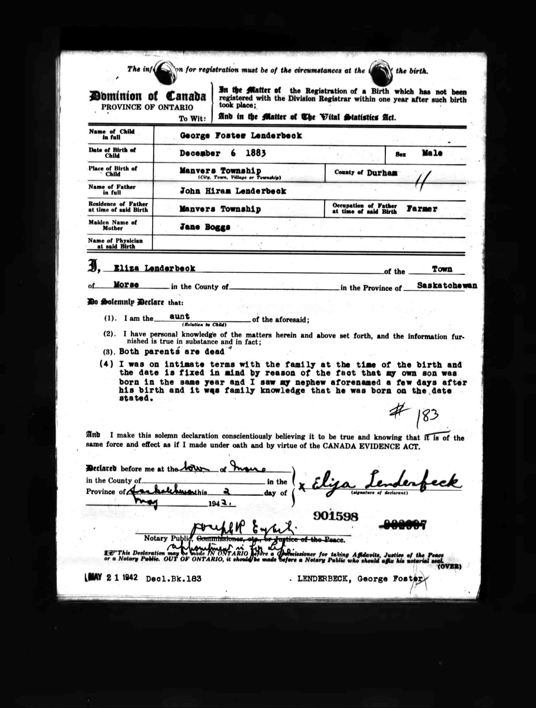 George Foster Lenderbeck Affidavit of Birth Certificate, 1942: