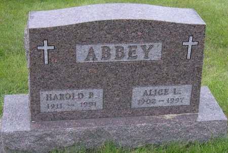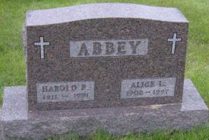 - Harold Burt Abbey: Born September 5, 1911, in Fond du Lac, Fond du Lac Co., WI; Died June 7, 1991, in Mercy Hospital, Cedar Rapids, Linn Co., IA (age 79). Buried in Baker Cemetery, Linn Co., IA. Married May 30, 1952, in Minneapolis, Hennepin Co., MN, to Alice Louise Phillipson: Born January 23, 1902, in Linn Co., IA; Died August 24, 1997, in the Meth-Wick Community, Cedar Rapids, Linn Co., IA (age 95). Buried in Baker Cemetery, Linn Co., IA. She lived in San Diego, CA, in 1981.