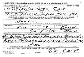 The WWII Draft Registration Report dated April 25, 1942, shows Charles Patrick Cain (age 49), born August 4, 1892, in Benson, MN, is living at 2712 N. Albinas Street, Portland, Multnomah Co., OR. He is employed at the Union Pacific Railroad Shop in Albina, Portland, OR. His named person who will always know his address is Mrs. Gladys Cain, 1903 S. Park Street, Madison, Dane Co., WI.