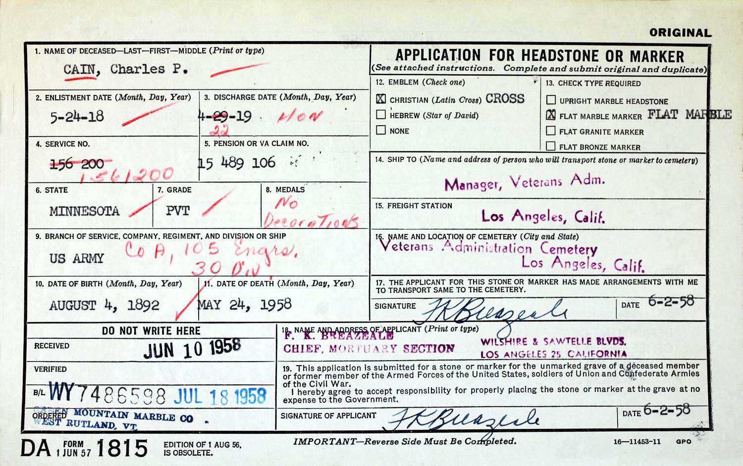 Charles Patrick Cain died May 24, 1958, in Fresno, Fresno Co., CA, at age 65. Buried in Los Angeles National Cemetery, Los Angeles, Los Angeles Co., CA.
