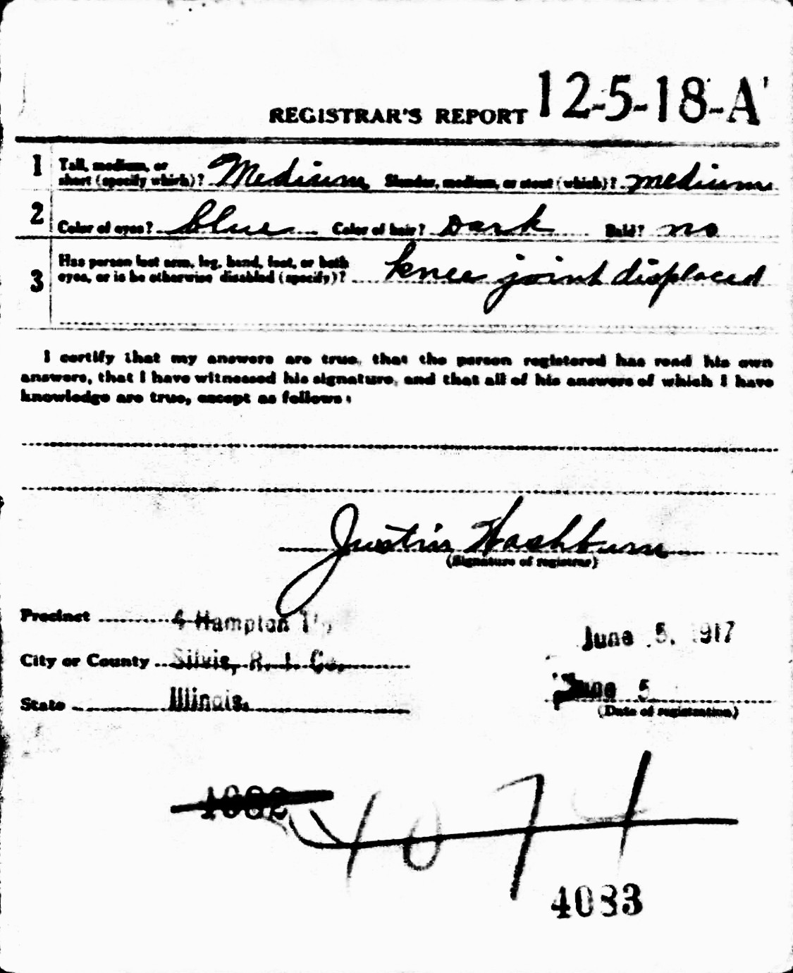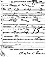 WWI Draft Registration Report dated June 5, 1917, shows Charles P. Cain, born August 4, 1892, in Tara Twp., Swift Co., MN, is working in the CRI & P Silvis Railroad Shop as a Boiler Maker Helper, and living at 159 5th Street, Silvis, IL. He is unmarried. He claims that he has a knee joint displaced.
