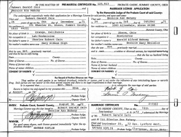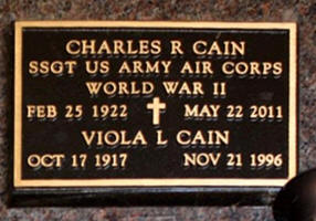 - Charles Robert Cain: Born February 2, 1922, in Moline, Rock Island Co., IL; Died May 22, 2011, in Orange, Orange Co., CA (age 89). Buried in Riverside National Cemetery, Riverside, Riverside Co., CA. Married (1) March 10, 1945, in Clark Co., WA, to Mary Aldean "Tinker" High: Born November 20, 1922, in McMinnville, Yamhill Co., OR; Died August 30, 2010, in McMinnville, Yamhill Co., OR (age 87). Buried in Evergreen Memorial Park, McMinnville, Yamhill Co., OR. Divorced 1952 in Orange Co., CA. Married (2) about 1953 in Unknown to Viola Lucille (Grebin) Parrish: Born October 17, 1917, in Hartford, Minnehaha Co., SD; Died November 21, 1996, in Orange Co., CA (age 79). Buried in Riverside National Cemetery, Riverside, Riverside Co., CA. Viola was first married June 17, 1939, in Sioux Falls, Minnehaha Co., SD, to William A. Parrish. Married (2) after 1969 in California to Alvira M. (Flannery) Snyder: Born about 1925 in Michigan. Alvira was first married (1) September 13, 1941, in Hazel Park, Oakland Co., MI, to Donald Frank Snyder: Born November 14, 1919, in Michigan; Died September 23, 1969, in Orange Co., CA (age 49). Buried in Good Shepherd Cemetery, Huntington Beach, Orange Co., CA. Charles and Aldean had one son, Robert Gerald "Bob" Cain, Born December 8, 1945, in Orange Co., CA; Died April 28, 2006, in Las Vegas, Clark Co., NV (age 60). Buried in Masonic Cemetery, McMinnville, Yamhill Co., OR.