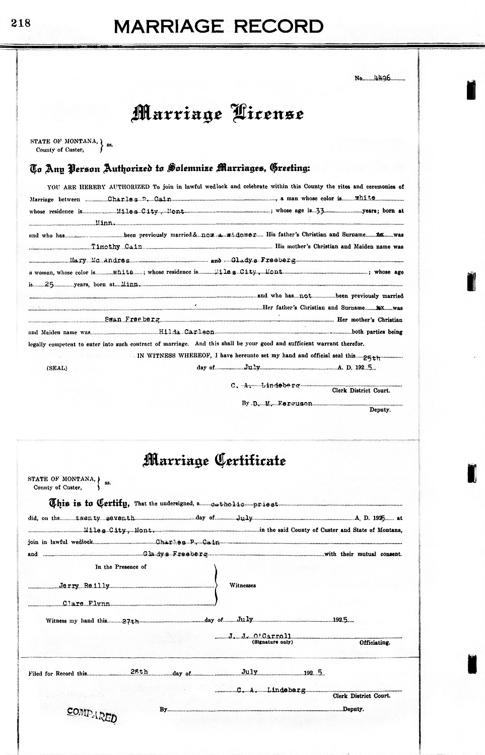 Charles Patrick Cain and Gladys Emilia "Glady" Freeberg were married July 27, 1925, in Miles City, Custer Co., MT.