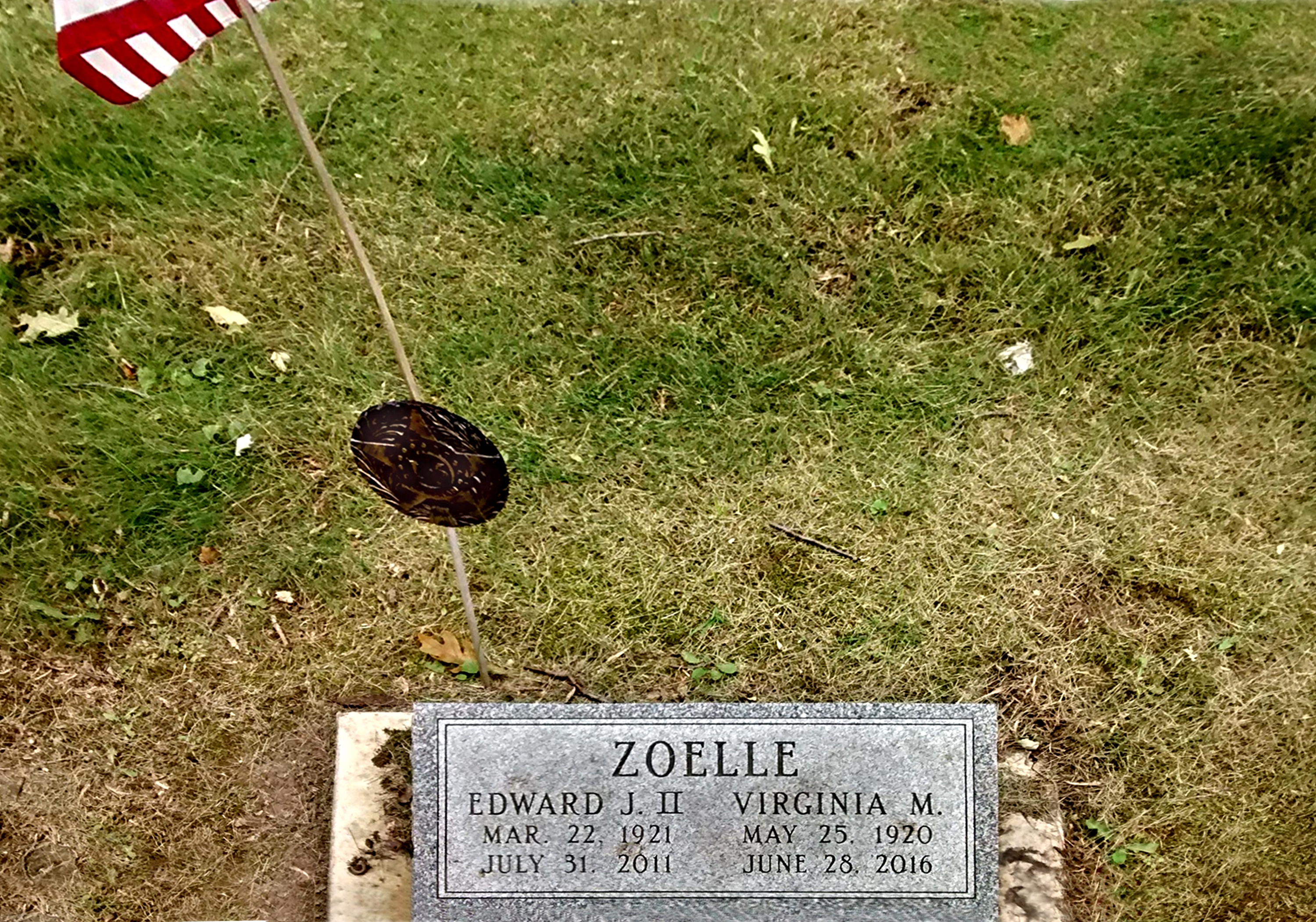 - Virginia M. Grabinski : Born May 25, 1920, in Fond du Lac, Fond du Lac Co., WI ; Died June 28, 2016, in the Village of Waterford, Racine Co., WI (age 96). Buried in Rienzi Cemetery, Fond du Lac, Fond du Lac Co., WI. Married April 23, 1942 at St. Joseph Catholic Church, Fond du Lac, Fond du Lac Co., WI, to Edward James "Ed" Zoelle Jr.: Born March 22, 1921, in Minnesota; Died July 31, 2011, in the Village of Waterford, Racine Co., WI (age 90). Buried in Rienzi Cemetery, Fond du Lac, Fond du Lac Co., WI.