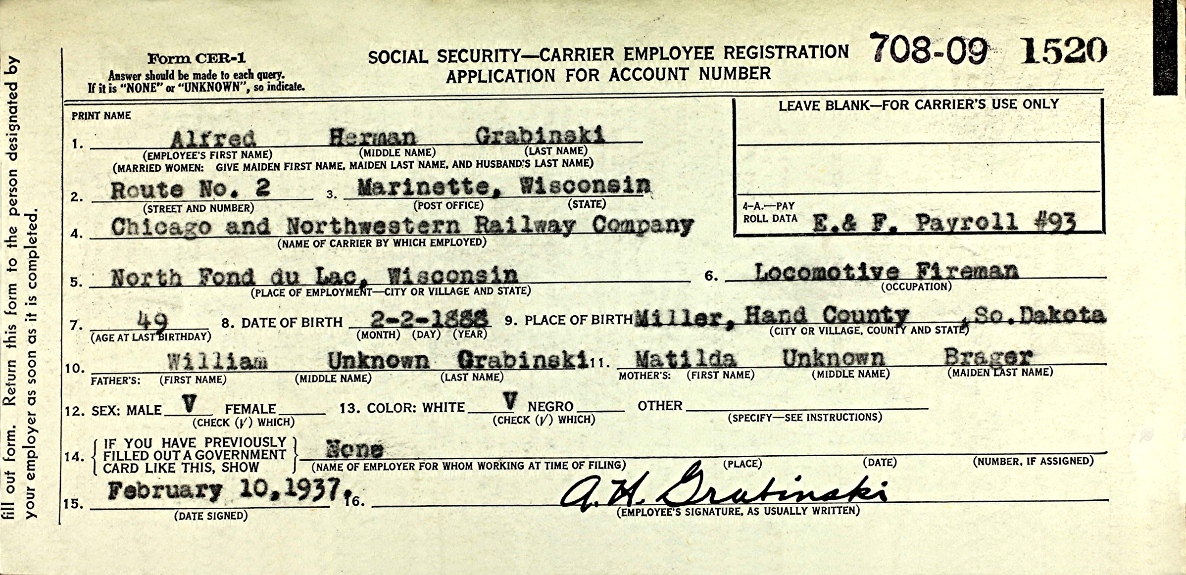 Alfred Herman Grabinski applied for his Social Security Carrier Account on February 10, 1937.