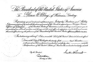 Appointment to Foreign Service Officer of Class Five, effective October 20, 1942, signed by President Franklin D. Roosevelt and Secretary of State Cordell Hull on November 21, 1942