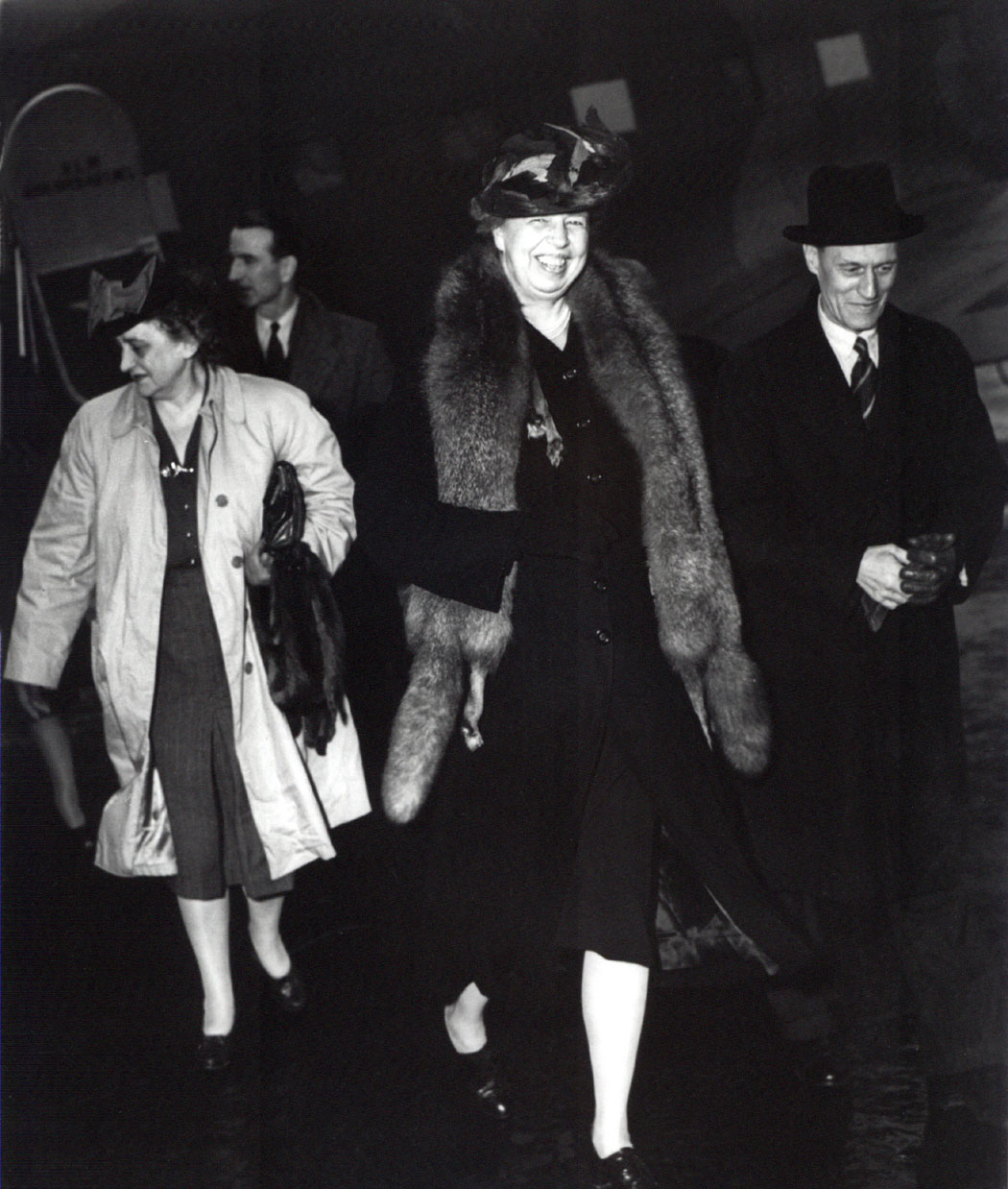 Mrs. Eleanor Roosevelt walking from the plane that carried her from the United States to England. Picture taken at Whitechurch Airdrome, five miles from Bristol, England, October 23, 1942. Shown: Unknown Woman, Glenn A. Abbey, Eleanor Roosevelt, W. Averell Harriman. Photo by U. S. Army Signal Corps.