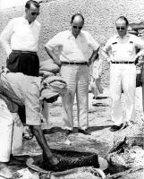 After being in Paraguay for a couple of years, Mr. Glenn Abbey probably served briefly in Uruguay and perhaps Argentina. In 1938 he was transferred back to Washington and put to work as one of the people charged with codifying the protocol of the Foreign Service. Mr. Abbey lived in Washington and worked there until 1940. About the summer of 1940 he was transferred as a Third Secretary to the Embassy in London. Mr. Abbey was in London during the Blitz and until 1943. While in London, Mr. Abbey never went to a bomb shelter, preferring to take his chances in his apartment where he was more comfortable. This was a very busy time. He first served under Ambassador Joseph Kennedy. In that time, he became friendly with the Kennedy children, and evidently was instrumental in assisting one of the daughters in her marriage to a British officer. Also during that time Joe Kennedy ordered Mr. Abbey to do something which Mr. Abbey thought was not correct, and upon being threatened with discharge or efforts to obtain his discharge, Mr. Abbey finally told Joe Kennedy that he would do what Mr. Kennedy ordered him to do if Mr. Kennedy would put it in writing, but Mr. Kennedy never would do that. In 1943 Glenn Abbey was ordered to New Delhi, India where he served for one year. Apparently the people in the consulate there or mission, whatever they had in New Delhi at the time, died or retired, and Glenn was sent there principally to reorganize the mission. He was very impressed by how many people there were in India at the time. Of course, Mr. Glenn Abbey, in his position as a Foreign Service office and a bachelor, was constantly being invited and giving parties in order to meet the people. And, of course, he met all of the top people almost everywhere. In 1944 he was sent into Burma to help set up the consulate there and we have a silver washed and hammered bowl given to him in memory of the deep affection that the Burmese people have for the Americans. Albert McNeel tried to give this bowl to the State Department, but they advised that they had too many artifacts already, and that at the present time, the relationship with the country that was Burma is so bad that there was nothing that they would be able to do with the bowl that would help anything. The bowl is probably brass, bronze or copper and then washed in silver. It is very pretty and about 10" in diameter and about 6" high and not heavy. In any event, from Burma Mr. Abbey was sent into Japan with General MacArthur in order to set up the consulate there. Glenn may have been given a rank of Brigadier General because in order to deal with the Japanese it was necessary to have an army rank. A picture shows him at his desk in Tokyo. After Japan, Mr. Abbey was sent to Indonesia to try to discover who and where the government of Indonesia was. It was fairly perilous duty, but he managed to have a good time and meet a lot of Indonesian people that were part Dutch and part native Indonesian.