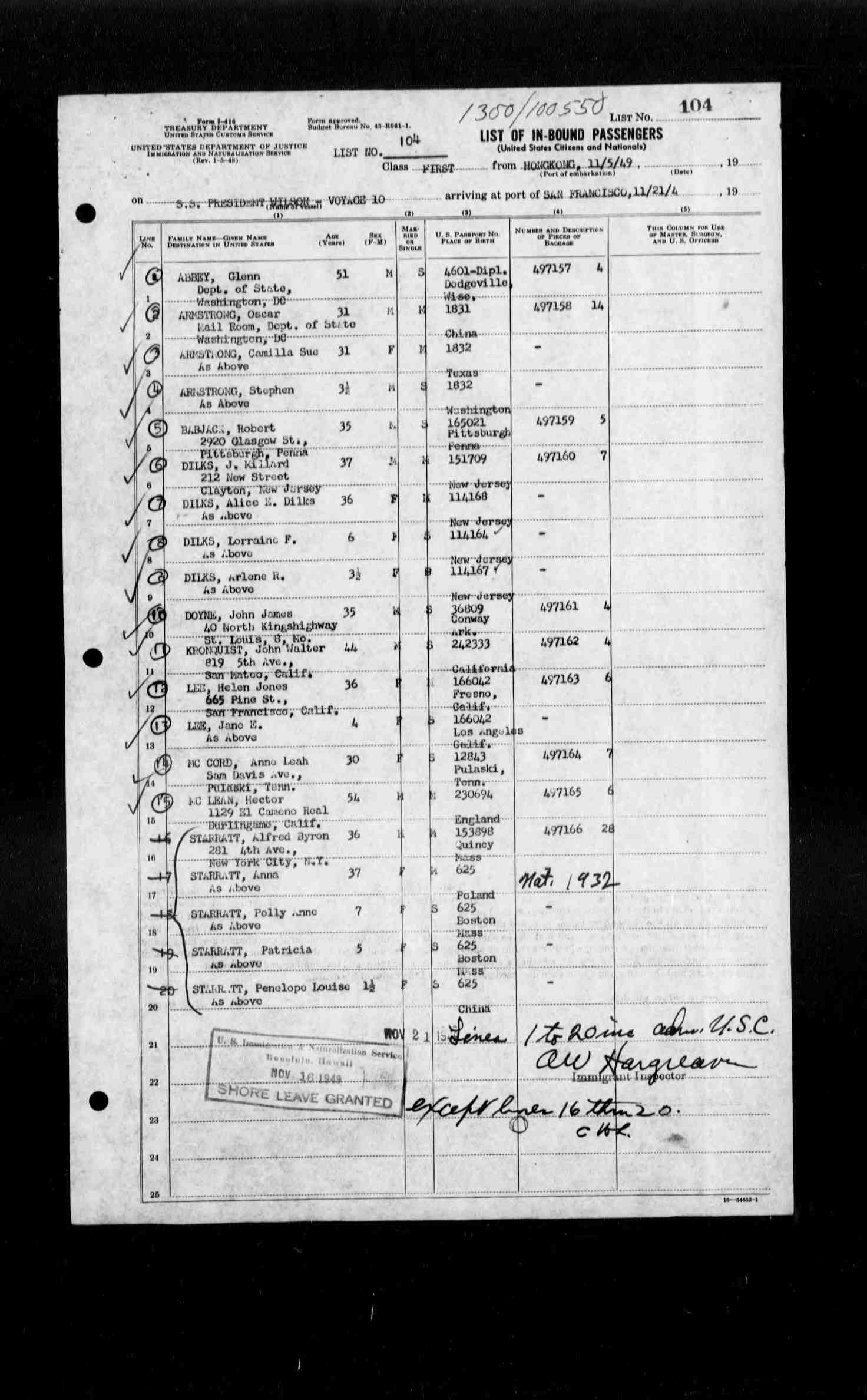 The 1930 U. S. Census shows Glenn A. Abbey (age 32) born in Wisconsin to Canadian and U.S. parents is an American Vice Consul in the Foreign Service of the U. S. A. living in Johannesburg, Transvaal, Union of South Africa as a boarder in the Edward Lawson household.
