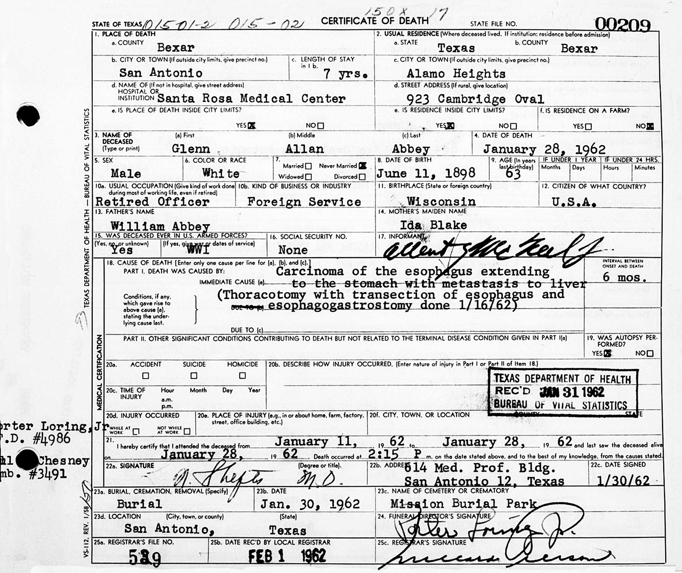 Glenn Allan Abbey died January 28, 1962, at the Santa Rosa Medical Center, 923 Cambridge Oval, Alamo Twp., San Antonio, Bexar Co., TX, at age 63. Buried in Mission Burial Park, San Antonio, Bexar Co., TX.