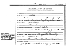 The Birth Record for Glenn Allan Abbey, found in the Iowa County, Wisconsin courthouse in Dodgeville. Please note that his name did not appear on the Birth Registration, probably because his name had not yet been chosen.