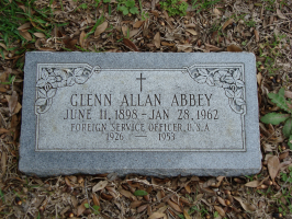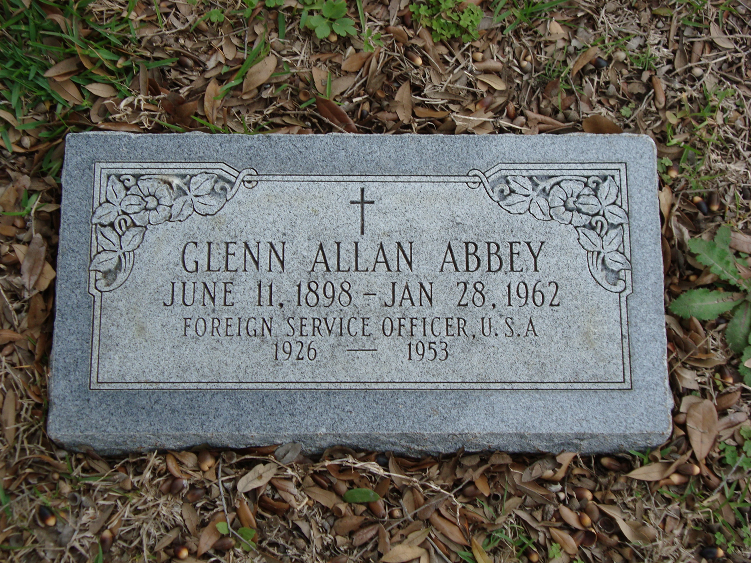 ABBEY, Glenn Allan, foreign service officer; born in Dodgeville, WI, June 11, 1898; son of William Sorrell and Ida Blake. B.S., Georgetown University, 1925; postgraduate University of Witwatersrand, Johannesburg, South Africa, 1929-1930. Unmarried. Instructor at Devitt Preparatory School, Washington, DC 1924-1925. Secretary to American High Command to Haiti, 1925-1927. Appointed foreign service officer, U.S. Dept. of State in 1927. Vice Consul Johannesburg, Union of South Africa, 1928-1931. Served as 3rd Secretary in Managua, Nicaragua, 1931-1932. Served as 3rd Secretary in Caracas, Venezuela 1931-1932. Serves as 2nd Secretary in La Asuncion, Paraguay, 1936-1937. Served as Assistant Delegate to Chaco Peace Conference in Buenos Aires, Argentina, 1938. Served with the Department of State 1938-1941. Served as 2nd Secretary, American Embassy, London, England 1941-1944. Served as Secretary of the American Mission in New Delhi, India 1944-1945. Was Officer-in-Charge in Rangoon, Burma, 1945-1946. Served as Secretary General for the Allied Council in Tokyo, Japan, 1946-1947. Was Consul and Delegate on Good Offices Commission of United Nations in Djakarta, Indonesia in 1947-1949. Was Consul General in Salonika, Greece, 1949-1951, and also at Sa'ana, 1951. Was Counsellor of Embassy and Deputy Chief of Mission, American Embassy, Jidda, Saudi Arabia, 1951-1953 and at Quito, Ecuador 1953-1954. He served in the U.S. Army 1918-1919. Clubs he belonged to were: Army and Navy (Washington, DC); Imperial Delhi Gymkhama (New Delhi, India). His home was Dodgeville, WI. Died January 28, 1962; buried in Mission Burial Park, San Antonio, TX.