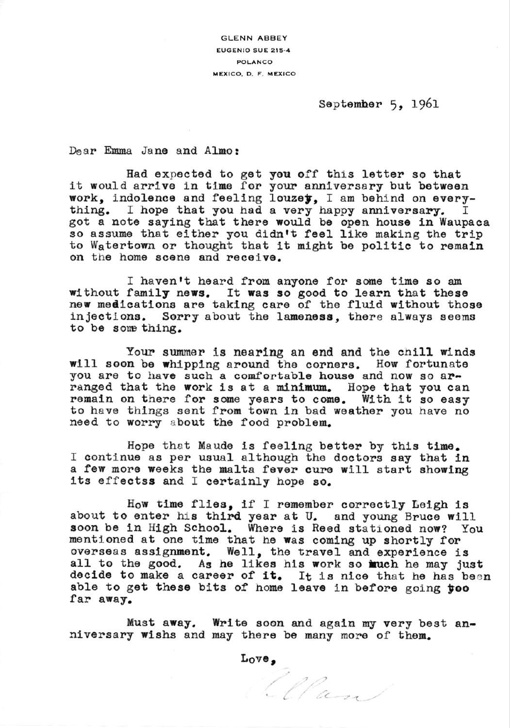 At first Mr. Abbey lived in Mexico City on a temporary visa but later he obtained permanent resident status as a "rentista". In Mexico City Glenn Abbey had a cook and a maid and had a very comfortable life similar to that which he was used to in the Foreign Service because he had mostly spent his time out of the United States and in a foreign country. There is a large Anglo-American colony in Mexico City, and Glenn Abbey still knew many people in the Foreign Service. The Ambassador to Mexico, at the time that Glenn Abbey moved there in 1955, had served under him in India. Glenn Abbey would write two, three or four letters every day to his friends in the Foreign Service all over the world, and kept in close touch with them. In a way, they were part of his family, and he was acquainted with their marital lives, their children, and their job experiences. Glenn Abbey was a great reader of history, he was very knowledgeable about music and art, and he could play bridge as well as any of the professional bridge players. He always played for money if it was appropriate, but he would never play for much money. Glenn Abbey really had a good time in Mexico and lived very comfortably. At the time of the Suez crisis, he was recalled to Washington in order to be debriefed about certain persons that he had met in Greece and in Saudi Arabia. Whatever country Glenn Abbey went to, he began learning the language of the country, having the habit of attempting to learn twelve new words every day on his morning walk. He was fluent in Spanish, and was fairly fluent in Greek, at least to the extent that he could speak with some local restaurant owners of Greek ascendancy who spoke Greek. Part of his job as a Foreign Service officer was to get to know everybody that he could and to observe everything about a country. Accordingly, he was a very interesting person to be with and talk to. In his job, Mr. Abbey was required to go to many parties & to have a drink of liquor at each one. He could drink a lot of liquor, and Albert McNeel never saw him stagger or stammer. One evening he came by the McNeel house for dinner in San Antonio, having had about five martinis before he got there, and you could not tell it. He sat and visited and drank whiskey until about 2:00 a.m. By 2:00 a.m. he was fairly tired, but he never let down his guard in any way. As the evening wore on, he would always have a "half" of a drink. The McNeels visited him in Mexico City each year after he moved there until his death, and discovered that he always took a nap after lunch for about 3 hours. This is one reason that he could stay up until 2:00 a.m. or 3:00 a.m. without showing much fatigue.