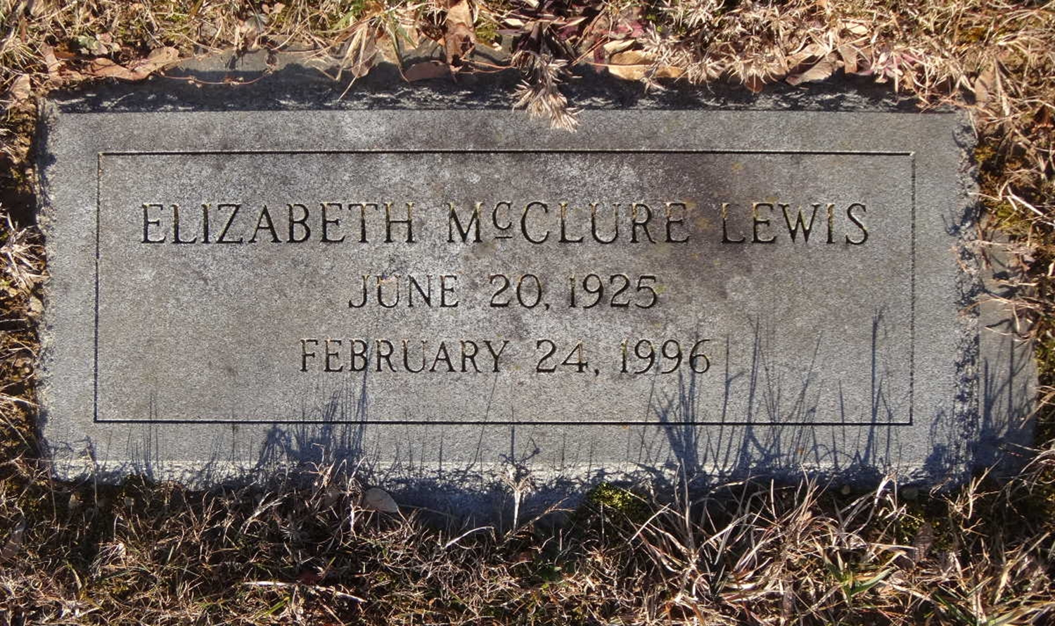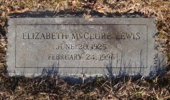 Julia Elizabeth "Lee" (McClure) Lewis died February 24, 1996, in Wilmington, New Castle Co., DE, at age 70. Buried in Lower Brandywine Presbyterian Church Cemetery, Owls Nest, New Castle Co., DE.