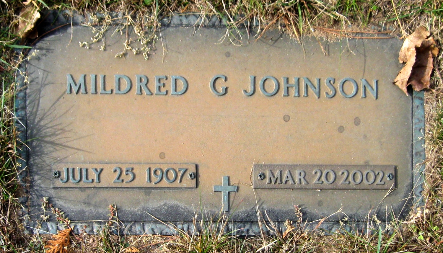 Mildred Gertrude Theresa (Lenius) Johnson died March 20, 2002, at Riverview Manor, Wisconsin Rapids, Wood Co., WI, at age 94. Buried in Westlawn Cemetery, Wisconsin Rapids, Wood Co., WI.