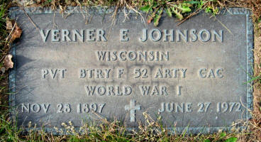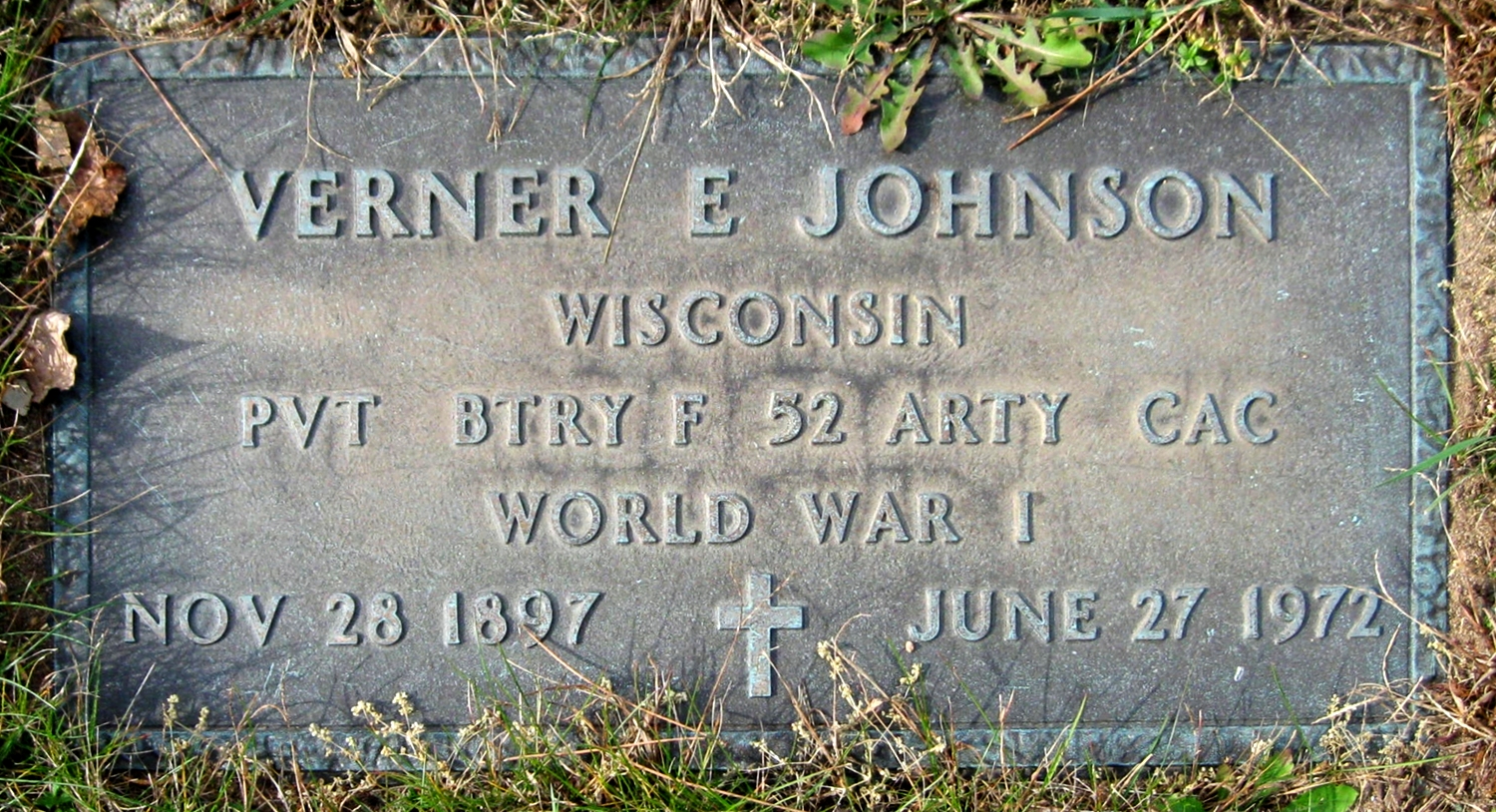 Verner Erick Johnson died June 27, 1972, at St. Michael's Hospital, Stevens Point, Wood Co., WI, at age 74. Buried in Westlawn Cemetery, Wisconsin Rapids, Wood Co., WI.
