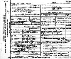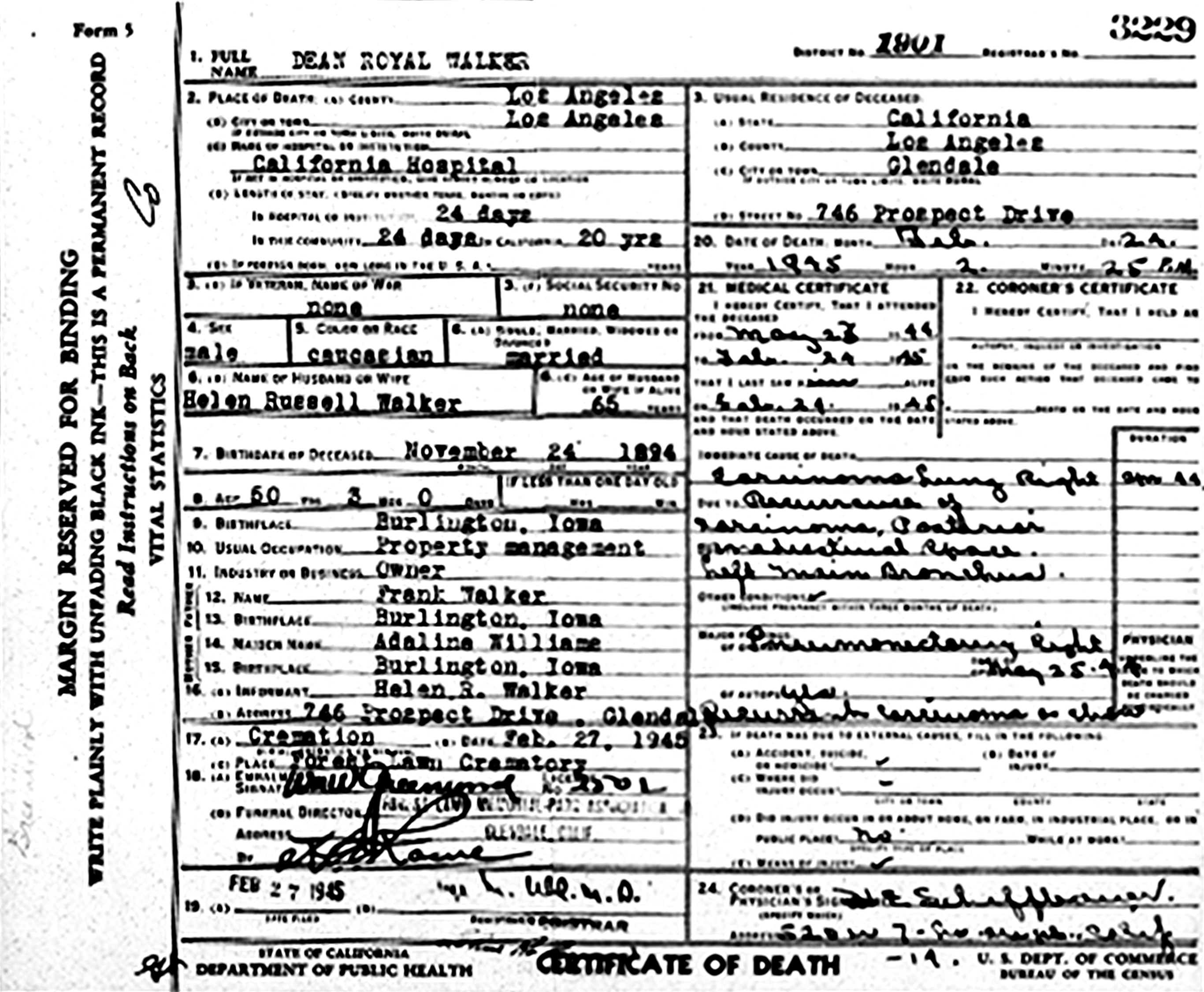 Dean Royal Walker died February 24, 1945, at California Hospital, Los Angeles, Los Angeles Co., CA, at age 50. Buried in Rose Hills Memorial Park, Whittier, Los Angeles Co., CA. He had lung cancer.