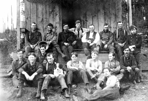 Harlan Burdine "Bert" Blake's logging camp crew on the steps of the logging camp mess hall, North Rosedale, WA, not far from Tacoma, 1905 . The Bert Blake crew appeared quite satisfied with the meal they just had. Harry Rowley, Camp Foreman, is the 2nd from the left on the porch with the tall boots. Source: Richard Rowley. Picture courtesy of the Haebor History Museum.