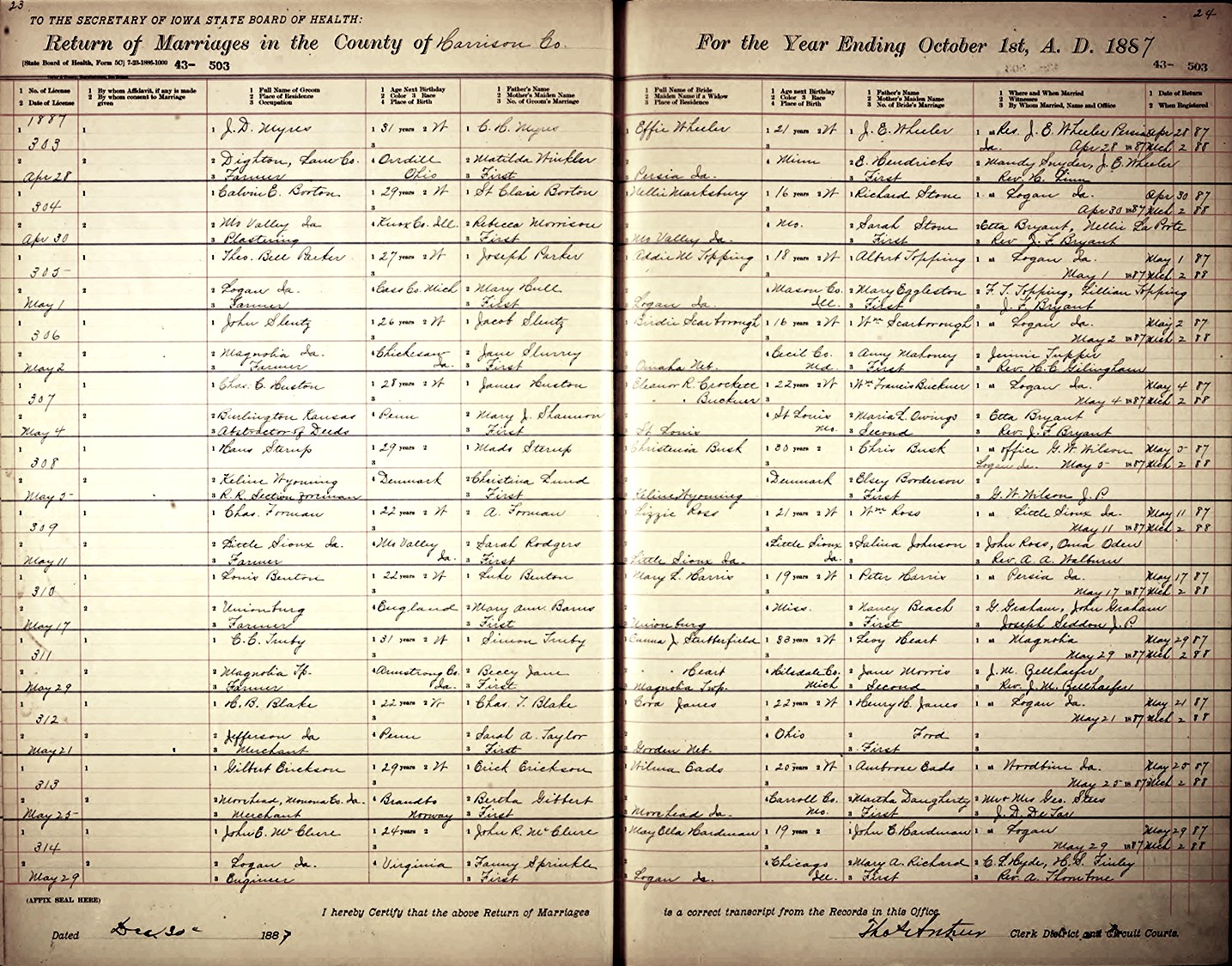 Harlan Burdine "Bert" Blake and Cora Unknown/Jones were married May 21, 1887, in Logan, Harrison Co., IA.